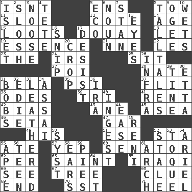 ACROSS 1. Is not 5. Followers of ems 8. Pull behind 11. _ gin 12. ____ d'Azur (French Riviera) 14. Ripen 15. Plunders 17. A city in N France, SE of Calais 18. Allow 19. Substance 21. Compass dir. 22. French article 23. Definite Article 24. Big collection agency 25. Be seated 27. Luau course 28. Nathan's nickname 31. Actor Lugosi 35. Air pressure measure (abbr.) 37. Sudden quick movement 38. Lyric poems 39. Three (prefix) 41. Monthly bill 42. Prejudice 43. One (Scot) 45. At sea 46. Bristle 47. Slender fish 49. Part of HMS, perhaps 51. Compass dir. 52. R.R. building 55. Had dinner 57. Slangy assent 60. Elected representative 62. For each 63. Inhabitant of Heaven 65. Resident of Iraq 66. Observe 67. Relationship diagram 68. A slight indication 69. Conclusion 70. Fast jet (abbr.) 71. Person who is morally reprehensible DOWN 1. Small island 2. Make a splashing sound 3. Trap for birds or small mammals 4. False hair 5. Environmental prefix 6. Part of speech 7. Comedian Laurel of Laurel & Hardy 8. Baron Munchausen's specialties 9. Double curve, resembling the letter S 10. Soaks 13. Snake ____ (dice throw) 16. Clip 17. Cease 20. Riding implement 26. Kind of red light 29. Prong on a fork 30. Singer James 31. Moves up and down 32. Singer Brickell 33. Tough but pliablecoriaceous 34. Slender Brazilian palm 36. Retirement account (abbr.) 40. Eat 44. Comfort 48. Painter Guido (1575-1642) 50. System (abbr.) 52. Lacking originality or spontaneity 53. Woman's close-fitting hat 54. Satellite of Uranus 55. Domed church section 56. Adolescent 58. Hearing organs 59. Sliced desserts 61. Bowlike part 64. Fish or hair follower