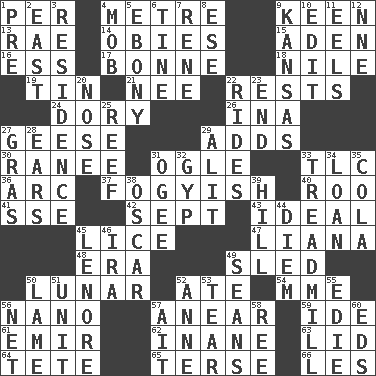 ACROSS 1. For each 4. Distance measurement (Brit.) 9. Peachy ____! 13. Actress Charlotte 14. Off-Broadway awards 15. An important port of Yemen 16. Curvy letter 17. Maid-servant 18. "Death on the ____" 19. Shallow baking pan 21. Born 22. Musical pauses 24. Dinghy 26. _ tizzy (2 wds.) 27. Honkers 29. Sums up 30. Indian princess (variant) 31. Stare 33. Affectionate concern, for short 36. Curve 37. Out of fashion; old fashioned 40. Friend of Pooh 41. Compass dir. 42. Back-to-school mo. 43. Standard of perfection 45. Louse (plural) 47. Woody, climbing, usually tropical plant 48. Period 49. Downhill vehicle 50. Type of eclipse 52. Had dinner 54. Madame (abbr.) 56. Billionth: prefix 57. Approach 59. Binary compound 61. Arab leader 62. Empty; void 63. Flaplike covering 64. False hair 65. Laconic 66. French article DOWN 1. Before (prefix) 2. 90 degrees 3. Dwelling 4. Disorderly crowd 5. Dark wood 6. Prong on a fork 7. French philosopher Descartes 8. Compass dir. 9. Sunflower state 10. Prepare for publication 11. Snakelike fish 12. Compass dir. 20. Characteristic smell of wine 22. Amusement-park features 23. Conclusion 25. Coral ridge 27. Pate de foie ____ 28. Hearing organs 29. Set down 31. Double curve, resembling the letter S 32. Hustle 33. Excercise machine 34. Grant temporary use of 35. Root beer relative 38. Motion picture award 39. Land elevation 44. South Vietnam president (1954) 45. Poe poem 46. Lyricist Gershwin 49. Actors Connery and Penn 50. Unable to walk 51. A single undivided whole 52. Queen of England 1702-14 53. Pull into pieces 55. Singer Brickell 56. Remaining after all deductions 57. Small island 58. To riddle 60. Begley and Asner
