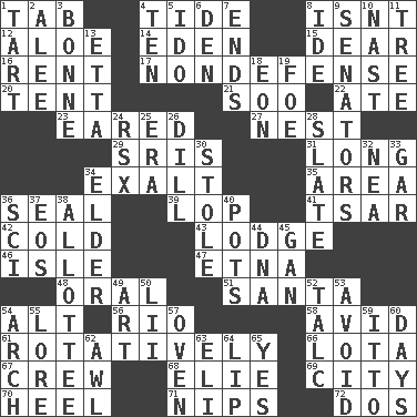 ACROSS 1. Bar bill 4. Periodic rise and fall of the sea level 8. Is not 12. Medicinal plant 14. Genesis locale 15. Letter starter 16. Monthly bill 17. Unrelated to defense, as in spending 20. Portable shelter 21. "Barney Miller" actor Jack 22. Had dinner 23. Having ears or earlike features 27. Egg locale 29. Indian titles of respect 31. Having great length 34. Glorify 35. Type of rug 36. Lick closed 39. Chop off 41. Russian ruler of old 42. Having a low temperature 43. Inn 46. Small island 47. Inactive volcano in Sicily 48. Of the mouth 51. Before Barbara or Clara 54. The first octave above the treble staff 56. _ de Janeiro 58. Enthusiastic 61. Producing rotation 66. Globular water bottle used in Asia 67. Ship's personnel 68. Writer Wiesel 69. Municipality 70. Person who is morally reprehensible 71. Cuts off 72. Two (Sp.) DOWN 1. Small pie 2. Toward shelter 3. Maid-servant 4. "___ Little Indians" 5. Wedding promise 6. Lair 7. Conclusions 8. Binary compound 9. Legislators 10. Political cartoonist Thomas 11. Family _ (genealogy) 13. Singer James 18. Period of immesurable duration 19. Enemy 24. Acura sports coupe 25. Epoch 26. Deli pickle 28. Chalkboard 30. Fur scarf 32. Teachers' org. 33. Slender fish 34. A person who is older than you are 36. _-fi 37. Greek goddess of the dawn 38. One to whom something is allotted 40. Cooking vessels 44. Heredity factor (abbr.) 45. Separate the seeds from cotton 49. Nonscientific branch of learning 50. Cards in a Roman deck? 52. Baby powder 53. Keep away from 54. Bowlike part 55. Old wives' tales, e.g. 57. Baking chamber 59. "Tell ____ the Marines!" 60. 24-hour periods 62. Leather borer 63. Biblical high priest 64. Mouth edge 65. It is so