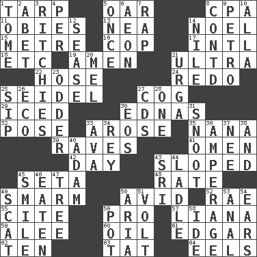 ACROSS 1. Canvas cover 5. Boat paddle 8. Tax preparer (abbr.) 11. Off-Broadway awards 13. Teachers' org. 14. Christmas carol 15. Distance measurement (Brit.) 16. Police officer (slang) 17. International (abbr.) 18. And so on (abbr.) 19. So be it 21. Extremist 22. Stockings 24. Do over again 25. Beer mug 27. Gear tooth 29. On the rocks 30. Ferber et al. 32. Airs 33. Came up 35. Nanny 39. All-night dance parties 41. Sign of things to come 42. 24 hours 43. Had an oblique or slanted direction 45. Bristle 48. Assign a rank or rating to 49. Excessive but superficial compliments 50. Enthusiastic 52. Actress Charlotte 55. Quote 56. Adept person 57. Climbing, woody, usually tropical vines 59. Toward shelter 60. Petroleum 61. _ Allan Poe 62. "___ Little Indians" 63. Make lace 64. Snakelike fish DOWN 1. Heavy book 2. Collude with 3. Actors Guy, Robert Welles, and Clint 4. For each 5. At one time in the past 6. A really long time 7. Reproach for some lapse or misdeed 8. Continued (abbr.) 9. Stone: prefix 10. Silent film actress Nazimova 12. Gospel singer Marvin 14. "Death on the ____" 20. Cartoonist voice _ Blanc 21. Capital and largest city of Mongolia 23. More peculiar 25. Small drink 26. Environmental prefix 27. Music discs 28. Single 30. Greek goddess of the dawn 31. Snob 33. Actress Gardner 34. Marina Del _, California 36. Electrical Measurement 37. Born 38. Plus 40. First of billions? 43. Indian title of respect (Mr.) 44. Dipping utensil 45. Grin 46. Consumed 47. Relationship diagram 49. Get outta here! 50. Roberta Peters solo 51. Electrical Unit 53. Of or related to the anus 54. Hearing organs 56. Plant holder 58. Binary compound