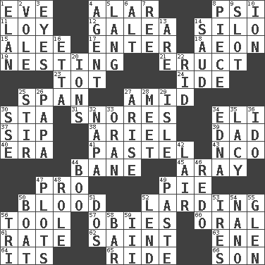ACROSS 1. First lady 4. Having or resembling wings 8. Air pressure measure (abbr.) 11. Myrna of the movies 12. An organ shaped like a helmet 14. Grain storage tower 15. Toward shelter 17. Keyboard key 18. Period of immesurable duration 19. Snuggling 21. Spew [out] 23. Small child 24. Binary compound 25. Connect, as a bridge 27. Among 30. R.R. building 31. Sounds asleep 34. Connecticut Ivy Leaguer 37. Small drink 38. Satellite of Uranus 39. Male parent 40. Period 41. Soft color 43. Non-commissioned officer (abbr.) 44. Object of repulsion 45. Like ___ of sunshine 47. Adept person 49. Sliced dessert 50. Vital fluid 52. Preparing or cooking with lard 56. Implement 57. Off-Broadway awards 60. Spoken 61. Pace 62. Virtuous person 63. Compass dir. 64. ___ a Wonderful Life 65. Travel on an animal 66. Boy, to dad DOWN 1. Style 2. Grand slam 3. Sight organs 4. Representative 5. Austrian-born American filmmaker Fritz 6. Keyboard modifier key 7. To riddle 8. Part 9. Groove 10. Electrically charged atom 13. "We ___ not amused" (Victoria) 14. Saudi Arabian king (1953-1964) 16. Singer James 20. Charged particles 22. To free from 25. Commotion 26. Dad 27. Ascend 28. Rendezvous 29. Capri or Wight 30. Compass dir. 32. California wine valley 33. NW Algerian seaport 34. Pulitzer Prize-winning author Ferber 35. Made of lace 36. Wedding promise 42. Den 44. Surprise greeting 46. Do over again 47. Graphs 48. Hero or heavy, e.g. 49. Thick mixture 50. Water vessel 51. Two (Sp.) 52. Grant temporary use of 53. Angers 54. Billionth: prefix 55. Small, secluded valley 56. Three (prefix) 58. Tavern 59. One more than two