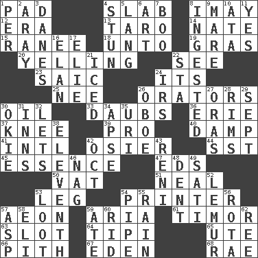 ACROSS 1. Writing tablet 4. Broad, flat, thick piece 8. "If ____ say so..." 12. Epoch 13. Pacific island yam 14. Nathan's nickname 15. Indian princess (variant) 18. To (old English) 19. Pate de foie ____ 20. Crying or shouting loudly 22. Perceive with the eye 23. Ketch in the Levant 24. ___ a Wonderful Life 25. Born 26. Speakers 30. Lubricate 33. Applies to a surface 36. One of the Great Lakes 37. Leg joint 39. Adept person 40. Moist 41. International (abbr.) 42. Flexible twig of a willow tree 44. Fast jet (abbr.) 45. Gist 47. Begley and Asner 50. Large container 51. Actress Patricia 53. Part of a journey 54. Hard copy producer 57. A really long time 59. Roberta Peters solo 61. The easternmost of the Lesser Sundas 63. Notch 64. Native american tent (variation) 65. Shoshoni 66. Heart or essence 67. Genesis locale 68. Actress Charlotte DOWN 1. For each 2. Like ___ of sunshine 3. Natives or inhabitants of Denmark 4. Surprise greatly 5. Austrian-born American filmmaker Fritz 6. Tate display 7. Oct. 31 cry 8. Eaten 9. Female horse 10. "One Day ___ Time" 11. Affirmative reply 16. Style 17. Writer Wiesel 21. On the rocks 22. R.R. building 24. Big collection agency 26. Mitch Miller's instrument 27. Mouths or openings 28. Basketball hoops 29. Back-to-school mo. 30. Migrant worker of the '30s 31. Lodging establishments 32. Allows 34. Domed church section 35. RI univ. 38. Veterans Day date 42. Sep. follower 43. Painter Guido (1575-1642) 46. Tired old horse 48. Undesirable depression on a surface 49. Suttee (variant) 52. Arboreal primate 53. Spoils 54. Corncob 55. Water falling in drops from the sky 56. Roll call or roster of names 57. Cleo's killer 58. Connecticut Ivy Leaguer 59. Had dinner 60. To free from 62. To separate or throw off
