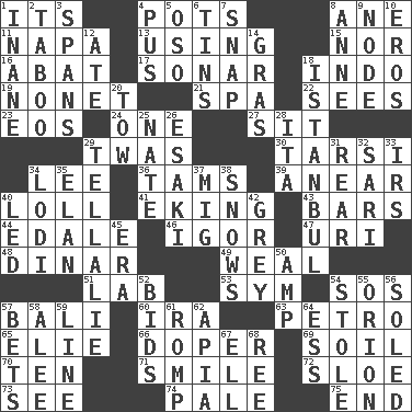 ACROSS 1. It is 4. Cooking vessels 8. One (Scot) 11. California wine valley 13. Putting into practice 15. Not either 16. Blind as ____ 17. Underwater navigation system 18. _ china 19. Music written for nine 21. Health resort 22. Observes 23. Greek goddess of the dawn 24. Single 27. Be seated 29. It was, poetically 30. Tarsus (plural) 34. Area sheltered from the wind 36. Scottish caps 39. Approach 40. Hang loosely or laxly 41. Supplementing with great effort 43. Taverns 44. Peak District village in England 46. Russian composer Stravinsky 47. RI univ. 48. Middle Eastern gold or silver currency 49. Welt 51. Experiment locale 53. Symbol (abbr.) 54. Mayday 57. Indonesian resort city 60. Lyricist Gershwin 63. Stone: prefix 65. Writer Wiesel 66. Drug addict 69. The visible part of the earth's surface 70. "___ Little Indians" 71. Grin 72. A type of plum 73. Observe 74. Diluted with white 75. Conclusion DOWN 1. Empty; void 2. Off limits 3. Connects, as a bridge 4. Product of festering 5. Bear (Spanish) 6. Airtight sealed metal containers 7. Fastener 8. Singer Murray 9. Connecting point 10. Greek god of love 12. Had dinner 14. Pate de foie ____ 18. Byzantium, centuries later 20. Pull behind 25. Nathan's nickname 26. 1973 Nobel Price Winner (Physics) Leo 28. Call ___ day 29. Copy Pinocchio 31. Tail end 32. Indian skirt 33. Big collection agency 34. Farming town in central California 35. Enthusiasm 37. Russian fighter aircraft 38. Overwhelms 40. Directed 42. Jennifer or Joel 45. Epoch 50. Electrical Unit 52. Auction offers 54. Fur scarf 55. Constellation of myth 56. Having a sole or soles 57. Antes 58. Toward shelter 59. Actor's bit 61. Play 62. Capital of Western Samoa 64. Double-curved letter 67. Pipe bend 68. Portuguese money of account (variant)
