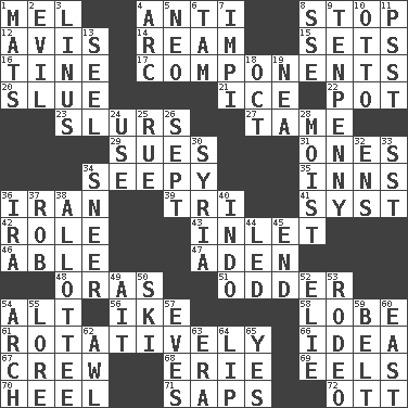 ACROSS 1. Cartoonist voice _ Blanc 4. Against 8. Close up, plug up 12. Deliberation 14. 480, 500 or 516 sheets of paper 15. Puts into a specified state 16. Prong on a fork 17. Pieces 20. Turn sharply 21. Frozen water 22. Cooking vessel 23. Plays smoothly or legato 27. Not wild 29. Takes to court 31. Washington bills 34. Oozy 35. Lodging establishments 36. SW Asia republic 39. Three (prefix) 41. System (abbr.) 42. Hero or heavy, e.g. 43. An arm off of a larger body of water 46. Competent 47. Arabian gulf 48. Mouths or openings 51. More peculiar 54. Keyboard modifier key 56. Eisenhower's nickname 58. Ear part 61. Rotating or pertaining to rotation 66. The content of cognition 67. Ship's personnel 68. One of the Great Lakes 69. Snakelike fish 70. Person who is morally reprehensible 71. Plant excrements 72. Baseball player Mel DOWN 1. Floor coverings 2. Tending to cause great harm 3. "_ and Lucy" (Charlie Brown theme song) 4. Curve 5. Modern: prefix 6. Scottish cap 7. Body of Kaffir warriors 8. Compass dir. 9. 3-inch nail 10. Von Bismarck 11. Inconspicuous attention getter 13. Stitch closed the eyes of (a falcon) 18. Sep. follower 19. Teachers' org. 24. Purpose 25. Regret 26. Back-to-school mo. 28. Damp 30. Damascus' land 32. Followers of ems 33. Fast jet (abbr.) 34. Contemptuous expression 36. Lyricist Gershwin 37. Director Reiner 38. One to whom something is allotted 40. _ china 44. Directed 45. Conclusion 49. Small island 50. What Jean-Claude Killy likes to do 52. Writer Wiesel 53. Cowboy competition 54. Bowlike part 55. Old wives' tales, e.g. 57. Nights before holidays 59. Waist strap 60. Compass direction 62. Leather borer 63. Period 64. Mouth edge 65. Affirmative reply