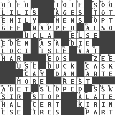 ACROSS 1. Butter sub 5. Carryall 9. "Barney Miller" actor Jack 12. Ms. Damita and namesakes 14. Eras 15. Small child 16. Poet Dickinson 17. Not women's 18. Elect 19. Turn to the right 20. Slept 23. In addition 24. Southern CA. univ. 25. Otherwise 27. Genesis locale 30. White ___ sheet 32. Expire 33. Event scenes 34. Small island 36. Large container 38. Spoil 39. Greek goddess of the dawn 40. Last letter of the English alphabet 43. Purpose 46. Evade 48. Keg 49. Island 51. Daniel's nick name 52. Johnson of "Laugh-In" 53. Greater amount 54. Take ten 56. Collude with 58. Had an oblique or slanted direction 61. Compass dir. 64. Title for a knight 65. Obstruct or block passage 66. Having winglike extensions 68. Actor Linden 69. Certainty 70. Japanese brewing company 71. Compass dir. 72. Angers 73. Component DOWN 1. Cassini of fashion 2. Citrus frut 3. Writer Wiesel 4. Petroleum 5. Pack (down) 6. Double curve, resembling the letter S 7. Watched over 8. Double-curved letter 9. Took without asking 10. I made a mistake 11. Von Bismarck 13. Synchronize (abbr.) 21. Mountain range southwest of Kyrgyzstan 22. Went by 23. At sea 24. Single; one (prefix) 26. 54 in ancient Rome 27. Shade tree 28. ___ good deed 29. Shade of tan 31. Verbally 35. Fortification 37. Russian ruler 41. Eastern Standard Time (abbr.) 42. Make supply last 44. Highlander 45. Hearing organ 47. Leg joint 48. Feline 50. Last 53. Haggard of country music 55. Neighbor of Neb. 56. American tennis player Robert 57. Prejudice 59. Old wives' tales, e.g. 60. Elects 61. "Two Mules for Sister ____" 62. Use a swizzle stick 63. Gone 65. _-fi 67. Mouth edge