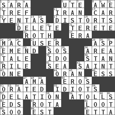 ACROSS 1. "Two Mules for Sister ____" 5. Shoshoni 8. Deep reverence 11. Not kosher 12. SW Asia republic 13. 4-wheeled motor vehicle 14. Gossips 17. What propaganda does 19. Erase 21. Cigar-shaped 22. Writer of Portnoy's Complaint (1969) 23. Epoch 24. Apple computer (short form) 27. One who uses or employs something 29. Viper 32. Make improvements or corrections to 34. Mayday 36. Length times width 37. Falsehood 38. Wedding promise 39. Comedian Laurel of Laurel & Hardy 40. Cause heat under the collar 41. Ocean 42. Virtuous person 43. Single 44. Northwest Algerian city 46. Curvy letter 47. Housemaid (var.) 50. Greek god of love 52. Spoke pompously 55. Foolish or stupid persons 57. Accusation by an informer 59. Ringlike coral islands and reefs 62. Begley and Asner 63. Round or rotation of duties 64. Spoils 65. "Barney Miller" actor Jack 66. Eastern Standard Time (abbr.) 67. Singer James DOWN 1. Filthy place 2. "We ___ not amused" (Victoria) 3. Tear apart 4. Following 5. RI univ. 6. Clothes sense 7. Keyboard key 8. 1/640 square mile 9. Electrical Unit 10. Celtic language 12. Binary compound 15. Verbally 16. Arranges properly for use 18. Mouth or opening 20. College paper 24. Paris' subway 25. At full speed 26. Cell (Danish) 28. Cowboy competition 29. Nick name for Arthur 30. Actors Connery and Penn 31. Leg coverings 33. Born 35. Flew 36. White ___ sheet 42. Snob 45. Roberta Peters solo 47. "One Day ___ Time" 48. Distance measurement (Brit.) 49. Goodbye (Sp.) 51. Fur scarf 52. Lyric poems 53. Make new 54. In addition 55. _ tizzy (2 wds.) 56. Position in a hierarchy or organization 58. Baseball player Mel 60. Car dealer's back yard 61. R.R. building