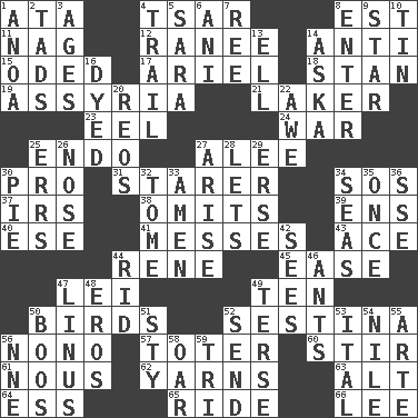 ACROSS 1. "One Day ___ Time" 4. Russian ruler of old 8. Eastern Standard Time (abbr.) 11. Tired old horse 12. Indian princess (variant) 14. Opposed to 15. Wrote a lyric poem 17. Satellite of Uranus 18. Comedian Laurel of Laurel & Hardy 19. Nineveh was its capital 21. Member of a famous L.A. basketball team 23. Snakelike fish 24. Armed conflict 25. Inside; within (prefix) 27. Toward shelter 30. Adept person 31. A viewer who gazes fixedly 34. Distress signal 37. Big collection agency 38. Leaves out 39. Followers of ems 40. Compass dir. 41. Makes clutter 43. Adept person 44. French philosopher Descartes 45. Relaxation 47. Luau accessory 49. Nine, plus one 50. Avian creatures 52. French poetic form 56. Words to Nanette 57. Carrier 60. Commotion 61. Horse sense 62. Tall tales 63. Keyboard modifier key 64. Double-curved letter 65. Travel on or in a vehicle 66. Area sheltered from the wind DOWN 1. Small Philippine buffalo 2. Small boys 3. Ripens 4. Go after with the intent to catch 5. "Two Mules for Sister ____" 6. Cuckoo 7. To riddle 8. Keyboard key 9. Play the lead 10. Metal container 13. Pipe bend 14. "____ silly question..." 16. Colored 20. Vintage cars 22. Deep reverence 25. Blunders 26. Characteristic smell of wine 27. Ascend 28. Allows 29. Celtic language 30. Sliced dessert 32. Heavy book 33. So be it 34. Oceans 35. At one time in the past 36. Compass dir. 42. Perceives with the eye 44. To free from 46. Pismires 47. "_ and Lucy" (Charlie Brown theme song) 48. Greek god of love 49. Laconic 50. Expressions of contempt or scorn 51. Filthy place 52. Transmit 53. Slanted text style (abbr.) 54. "Death on the ____" 55. Johnson of "Laugh-In" 56. Compass dir. 58. Boat paddle 59. Three (prefix)
