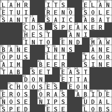 ACROSS 1. Cowardly lion portrayer 5. ___ a Wonderful Life 8. Enthusiasm 12. Needle holder 13. Western Nevada city 15. Flatfish 16. Before Barbara or Clara 18. Ketch in the Levant 19. Blind as ____ 20. Music discs 22. Orator 24. Behest 26. Cuckoo 27. To the inside or interior of 28. Conclude 29. Informal term for the mouth 32. Object of repulsion 35. Lodging establishments 37. One (Scot) 38. Musical composition 39. Allow 40. Russian composer Stravinsky 41. Direct toward a target or goal 42. Fermented drink made from hops 43. Trig term 44. Keyboard key 45. Arrange properly for use 46. Compass direction 49. Spanish title 50. Singer James 51. Opts 55. Period of immesurable duration 56. Greek god of love 57. Mouths or openings 59. Tolerate 63. Olfactory organ 64. Pinches, bites 65. Freehold land 66. Moved rapidly 67. Compass dir. 68. Tennis shots DOWN 1. French article 2. _ moment's notice (2 wds.) 3. Attila the _ 4. Actors Guy, Robert Welles, and Clint 5. Big collection agency 6. Beverages made from leaves 7. Sever or remove by pinching or nipping 8. 1973 Nobel Price Winner (Physics) Leo 9. Ear part 10. Having or resembling wings 11. Fish or hair follower 14. Seas 17. Arabian gulf 21. Fast jet (abbr.) 23. Added to 25. Bathroom 28. Main course 29. Wise men 30. At once, immediately (arch.) 31. We are 32. Water vessel 33. Capital of Western Samoa 34. Unfeeling 36. Born 40. Byzantium, centuries later 42. Gillaume's butler role 45. "Barney Miller" actor Jack 47. Had dinner 48. Portico 49. Administered medicine 51. Riding implement 52. Flexible conduit 53. 4th largest of the Great Lakes 54. Plant excrements 56. Followers of ems 58. Compass dir. 60. Wedding promise 61. Small moist lump or mass 62. Raised railways