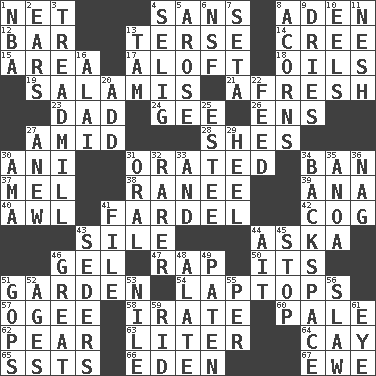 ACROSS 1. Remaining after all deductions 4. Without 8. Arabian gulf 12. Tavern 13. Laconic 14. Algonquian 15. Type of rug 17. At or to great height 18. Lubricates 19. Deli grouping 21. Anew 23. Male parent 24. Unit of force equal to gravity 26. Followers of ems 27. Among 28. "______ My Girl" (Turtles hit) 30. Black tropical American cuckoo 31. Spoke pompously 34. Prohibit 37. Cartoonist voice _ Blanc 38. Indian princess (variant) 39. Santa ___, CA 40. Leather borer 41. Bundle 42. Gear tooth 43. Drop; flow; fall 44. "____ silly question..." 46. Set 47. Reproach for some lapse or misdeed 50. ___ a Wonderful Life 51. Place where plants grow 54. Portable computers 57. Double curve, resembling the letter S 58. Feeling or showing extreme anger 60. Light colored 62. Lightbulb-shaped fruit 63. 61 cubic inches 64. Island 65. Fast planes 66. Genesis locale 67. She-sheep DOWN 1. Basketball assoc. 2. Hearing organs 3. Excercise machine 4. Major League Baseball Commissioner Bud 5. Came up 6. Science/research agcy. 7. Bristle 8. Oak nuts 9. Frees from moisture 10. Snakelike fish 11. Tender 13. Scottish cap 16. Jai _ 20. Increase 22. Nourish 25. First name in cosmetics 27. Afresh 29. The bottom of a shoe or boot 30. Housemaid (var.) 31. Taken by mouth 32. More valued for its uncommonness 33. Also 34. Keyboard key 35. Small Philippine buffalo 36. Tired old horse 41. Do some clerical work 43. Spring feasts 44. Small island 45. Halt 46. Relatively large 48. Having winglike extensions 49. Eucharist need 51. Republicans 52. Ripens 53. The longest river in the world 55. For each 56. Cole _ (cabbage dish) 59. To free from 61. Sight organ