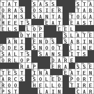 ACROSS 1. Make lace 4. Backtalk 8. R.R. building 11. Mouths or openings 13. Flexible twig of a willow tree 15. Bar bill 16. Basketball hoops 17. Before Barbara or Clara 18. Ancient Roman robe 19. Confronts 21. Ingest 22. 90 degrees 23. Raised railways 24. Chop off 27. Snakelike fish 29. Unit of force 30. Schedule 34. Black tropical American cuckoo 36. Extremities 39. Unit of acoustic absorption 40. Lyric poems 41. Snout, nose 43. Actor's bit 44. Table seasonings 46. Without 47. It is 48. Fourth or lowest deck 49. Have the gumption 51. Reproach for some lapse or misdeed 53. Period 54. Compass dir. 57. Trial 60. _ tizzy (2 wds.) 63. Eroded 65. Arches 66. Having a sole or soles 69. Sweet dark-red dessert wine 70. Friend of Pooh 71. Phone greeting 72. Hoop that covers a wheel 73. Pacific Standard Time (abbr.) 74. (Had) reclined 75. 4-wheeled motor vehicle DOWN 1. Singer Mel 2. Satellite of Uranus 3. Corrects by punishment or discipline 4. Distress signal 5. White ___ sheet 6. Trig term 7. Stalk of a moss capsule 8. Portico 9. Labels 10. Blind as ____ 12. Fast jet (abbr.) 14. Assign a rank or rating to 18. Copy Pinocchio 20. Insidious 25. Singles 26. Actor Sean's family 28. Curvy letter 29. What propaganda does 31. "This won't hurt ____!" 32. Airtight sealed metal containers 33. Compass dir. 34. The sixth month of the Jewish calendar 35. 1994 drama film starring Jodie Foster 37. ___ good deed 38. Something which is sent 40. Bear (Spanish) 42. Russian ruler of old 45. Health resort 50. Actress Charlotte 52. Expression of disdain 54. Unemotional 55. Father Junipero _ 56. Keyboard key 57. Canvas cover 58. Greek god of love 59. Highlander 61. Christmas carol 62. Silent film actress Nazimova 64. Fitting 67. Connecticut Ivy Leaguer 68. Spanish title