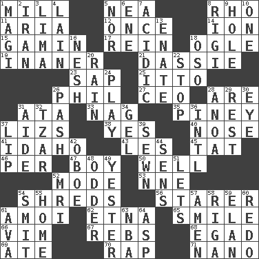 ACROSS 1. Place where flour is made 5. Teachers' org. 8. 17th letter of the Greek alphabet 11. Operatic vocal solo 12. At one time in the past 14. Electrically charged atom 15. Homeless child 17. It's straight from the horse's mouth 18. Stare at amorously 19. More empty; more void 21. Small ungulate mammals of Africa 23. Plant excrement 25. "Tell ____ the Marines!" 26. Silvers or Donahue 27. Corporate head (abbr.) 28. "We ___ not amused" (Victoria) 31. "One Day ___ Time" 33. Tired old horse 35. Abounding in pines 37. Belonging to Elizabeth 38. Consenting reply 40. Sense of smell 41. Potato state 43. French article 45. Make lace 46. For each 47. Male child 50. Not ill 52. Method 53. Compass dir. 54. Tears up 56. A viewer who gazes fixedly 61. Mine, in Marseilles 62. Inactive volcano in Sicily 65. Grin 66. Zeal 67. Confederate soldiers (slang) 68. Mild oath 69. Had dinner 70. Hit sharply and swiftly 71. Billionth: prefix DOWN 1. Wise men 2. SW Asia republic 3. Pale green bean 4. (Had) reclined 5. And not 6. Compass dir. 7. Being or containing an acid 8. Swiss mountan, "Queen of the Mountains" 9. Hollow 10. Single 13. Maternal 16. Tender 18. Bear (Spanish) 20. Precipitation 22. Cease 24. Frolic 26. Romantic infatuation 28. Small Philippine buffalo 29. State of inaction 30. Sight organ 31. Assistant 32. Czar 34. Set 36. International (abbr.) 37. Mouth edge 39. Stitched 42. Mitch Miller's instrument 44. Elected reps. 48. More peculiar 49. Next before 51. Allows 52. Medical imaging device (abbr.) 54. Stricken, poetically 55. Dwelling 57. So be it 58. Capital of Latvia 59. Style 60. Do over again 61. Actress Gardner 63. Basketball assoc. 64. Cleo's killer