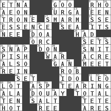 ACROSS 1. Inactive volcano in Sicily 5. Thick or sticky substance 8. 17th letter of the Greek alphabet 11. Period of immesurable duration 12. Capital and largest city of Mongolia 14. Car or cant ending 15. Marketplace scale 17. Excessive but superficial compliments 18. Compass dir. 19. Gist 21. Ocean 22. It is 23. Born 24. ___ good deed 25. Possessed 27. The grampus (Milton) 28. Puts into a specified state 31. Fastener 35. Spanish title 37. In a ____ (agitated or irritated) 38. Expression of disdain 39. Armed conflict 41. Land measure 42. In addition 43. Separate the seeds from cotton 45. Rendezvous 46. It's straight from the horse's mouth 47. Director Reiner 49. Put into a specified state 51. Wedding promise 52. Lion 55. Car dealer's back yard 57. Cleo's killer 60. Separating forcefully 62. Wing 63. A city in N France, SE of Calais 65. "_____ Recall" 66. Nine, plus one 67. Table seasoning 68. False hair 69. Being at a high temperature 70. To sift 71. Ancient Greek god of war DOWN 1. Consumed 2. Laconic 3. Trap for birds or small mammals 4. Queen of England 1702-14 5. Chewing product 6. Mouths or openings 7. Legendary monster 8. Dwelling 9. Behest 10. Singles 13. Nanny 16. Inside; within (prefix) 17. Manatee 20. Drawstring 26. Indian state 29. Become fatigued 30. Proofreading order 31. Coast Guard woman 32. "Death on the ____" 33. Aide 34. Give a jingle 36. Tired old horse 40. Noteworthy scarcity 44. Thickened enlargement 48. Water vessel 50. Bits 52. 61 cubic inches 53. Maternal 54. Stares at amorously 55. Thin strip of wood or metal 56. Butter sub 58. Fly high 59. Whine 61. Roll call or roster of names 64. Had dinner