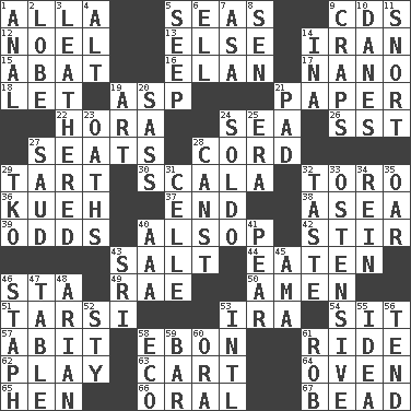 ACROSS 1. Silent film actress Nazimova 5. Oceans 9. Music discs 12. Christmas carol 13. Otherwise 14. SW Asia republic 15. Blind as ____ 16. Style 17. Billionth: prefix 18. Allow 19. Viper 21. Some stationery 22. Israeli folk dance 24. Ocean 26. Fast jet (abbr.) 27. Theater features 28. Drawstring 29. Small pie 30. Any of the three canals of the cochlea 32. "Corrida" creature 36. Malaysian steamed pastry 37. Conclude 38. Toward the sea 39. Likelihood 40. Columnist Joseph or Stewart 42. Disorderly outburst 43. Table seasoning 44. Consumed 46. R.R. building 49. Actress Charlotte 50. So be it 51. Tarsus (plural) 53. Retirement account (abbr.) 54. Be seated 57. "This won't hurt ____!" 58. Inky black, to poets 61. Travel on or in a vehicle 62. Shaw product 63. Draw slowly or heavily 64. Baking chamber 65. Layer 66. Taken by mouth 67. Necklace unit DOWN 1. Of or related to the anus 2. Ear part 3. Resembling or made to resemble leather 4. The first octave above the treble staff 5. Ooze 6. Pipe bend 7. White ___ sheet 8. Elected rep. 9. Dice game 10. Natives or inhabitants of Denmark 11. Derisive sound 14. _ tizzy (2 wds.) 19. Nonscientific branch of learning 20. Backtalk 21. Writing tablet 23. Curses 24. Twentieth part of a lira 25. Epoch 27. Saudi Arabian king (1953-1964) 28. 2nd pers. sing. pres. of can (arch.) 29. Ring climax 31. Cell (Danish) 32. Clothes sense 33. Clearly or manifestly demonstrative 34. It's straight from the horse's mouth 35. Boat paddle 40. American Automobile Association (abbr.) 41. Lightbulb-shaped fruit 43. _ Lanka 45. Nursemaid (var.) 46. Staphylococcus 47. Eating place 48. Believer in; advocate of (suffix) 52. Filthy place 53. International (abbr.) 55. The content of cognition 56. Be inclined (to) 58. Environmental prefix 59. Oblong piece of solid material 60. Mouth or opening 61. Director Reiner