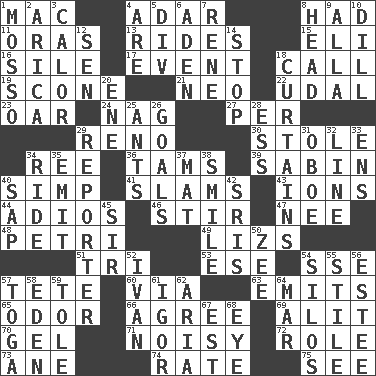 ACROSS 1. Apple computer (short form) 4. The sixth month of the Jewish calendar 8. Possessed 11. Mouths or openings 13. Amusement-park features 15. Biblical high priest 16. Drop; flow; fall 17. Happening 18. Give a ring to 19. Biscuitlike quick bread 21. Modern: prefix 22. Freehold land 23. Boat paddle 24. Tired old horse 27. For each 29. Western Nevada city 30. Took without asking 34. Portuguese money of account (variant) 36. Scottish caps 39. Unit of acoustic absorption 40. Simple or foolish person 41. Hits or strikes with great force 43. Charged particles 44. Goodbye (Sp.) 46. Commotion 47. Born 48. _ dish (used to culture cells) 49. Belonging to Elizabeth 51. Three (prefix) 53. Compass dir. 54. Compass dir. 57. Wig 60. By way of 63. Gives off 65. Scent 66. Match 69. Came down and settled, as after flight 70. Set 71. Annoyingly loud 72. Hero or heavy, e.g. 73. One (Scot) 74. Pace 75. Observe DOWN 1. With motion or animation 2. N. Chile seaport 3. Bodily heat indicating an inflammation 4. "We ___ not amused" (Victoria) 5. HTML Container Element 6. An important port of Yemen 7. French philosopher Descartes 8. Froth on beer 9. Silent film actress Nazimova 10. Deli pickle 12. Elected rep. 14. Halt 18. Window treatments 20. Compass dir. 25. Pismires 26. Finish lines 28. Curvy letter 29. Newsperson 31. Mitch Miller's instrument 32. Actor's bit 33. Followers of ems 34. Travel on or in a vehicle 35. Give off 37. Floor covering 38. Grin 40. Plant excrement 42. Indian titles of respect 45. Title for a knight 50. Last letter of the English alphabet 52. _ the terrible 54. Grain storage towers 55. Vertical member of a panel or frame 56. First name in cosmetics 57. Ancient Roman robe 58. Locale of original sin 59. Lacquered or enameled metalware 61. Russian composer Stravinsky 62. Roberta Peters solo 64. Third mo. 67. Eastern Standard Time (abbr.) 68. Sight organ