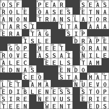 ACROSS 1. Order of Saint Francis (abbr.) 4. Lightbulb-shaped fruit 8. Oceans 12. Hero or heavy, e.g. 14. Fertile tracts in a desert 16. Inactive volcano in Sicily 17. At once, immediately (arch.) 18. Interpreter 20. Tarsus (plural) 22. Call ___ day 23. Auto club (abbr.) 24. Period 25. Label 28. Small drink 30. Small island 31. Window treatment 35. Republican Party 37. Rendezvous 40. Northwest Algerian city 41. Be footloose 42. Slender Brazilian palm 44. The longest river in the world 45. Actor Baldwin 46. Snakelike fish 47. Scottish cap 48. Ferber et al. 50. Inside; within (prefix) 52. Corporate head (abbr.) 54. R.R. building 55. Floor protector 58. Allow 61. Nanny (var.) 63. New (sp.) 65. The property of being fit to eat 70. Constrict 71. Beget 72. Mole, birthmark 73. 4th largest of the Great Lakes 74. Adolescent 75. Left 76. Begley and Asner DOWN 1. Speak pompously 2. Underwater navigation system 3. Plants 4. Plant holder 5. Ewer handle 6. White ___ sheet 7. Painter Guido (1575-1642) 8. Ocean 9. Singer James 10. Small Philippine buffalo 11. "Two Mules for Sister ____" 13. Followers of ems 15. Fast planes 19. Put down 21. ___ a Wonderful Life 26. _ mater 27. Honkers 29. Right away 30. Medicinal drug used to evoke vomiting 32. Operatic vocal solo 33. Inside of hand 34. Compass dir. 35. Gilt 36. Baking chamber 38. Compass dir. 39. Falsehoods 41. Actress Charlotte 43. Is not 49. Lick closed 51. Daniel's nick name 53. Sign of something about to happen 55. Distance measurement (Brit.) 56. Prevent from happening 57. Drinks excessively 58. For fear that 59. Singer Brickell 60. Become fatigued 62. Afresh 64. Purpose 66. Benjamin's nick name 67. Night before a holiday 68. Player for Phoenix 69. Fast jet (abbr.)