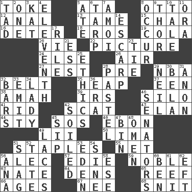 ACROSS 1. Puff or smoke 5. _ moment's notice (2 wds.) 8. Von Bismarck 12. Of or related to the anus 13. Not wild 15. Burn to charcoal 16. Prevent from occurring 18. Greek god of love 19. Root beer relative 20. Compete 22. Photo 24. Otherwise 26. Wind 27. Egg locale 28. Before (prefix) 29. Basketball assoc. 32. Waist strap 35. Pile 37. Car or cant ending 38. Wet nurse 39. Big collection agency 40. Grain storage tower 41. To free from 42. Scram, to a cat 43. Enthusiasm 44. Filthy place 45. Mayday 46. Inky black, to poets 49. Cards in a Roman deck? 50. Pale green bean 51. Paper fasteners 55. Fish or hair follower 56. Actor Baldwin 57. Singer Brickell 59. Impressive in appearance 63. Nathan's nickname 64. Hiding places for outlaws 65. Coral ridge 66. Eons 67. Born 68. In a ____ (agitated or irritated) DOWN 1. Small amount or degree 2. Single 3. Krazy ___ of comics 4. Veterans Day date 5. Had dinner 6. Canvas cover 7. Mine, in Marseilles 8. Happen 9. Son of Odin 10. Story 11. Mouth or opening 14. Fortification 17. Cause heat under the collar 21. Curvy letter 23. Make a knot 25. Moral principles 28. Soft color 29. Famous astronaut Armstrong 30. Actor Lugosi 31. Soon (poet.) 32. Long, evenly shaped pieces 33. Send forth 34. Kenny Rogers chart-topper in '80 36. Period 40. Elected representatives 42. Dirtied 45. Small drink 47. Storage container 48. Presage 49. Shoestrings 51. Volcanic refuse 52. Wig 53. Paradise 54. Trig term 56. Santa ___, CA 58. Compass dir. 60. Benjamin's nick name 61. Luau accessory 62. Newt