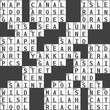 ACROSS 1. Atlas unit 4. Lessep's creation 9. Small island 13. Wedding promise 14. Came up 15. Precipitation 16. Slender fish 17. Amusement-park features 18. Mouths or openings 19. Mountains (abbr.) 21. Ocean 22. Type of eclipse 24. Pace 26. Compass dir. 27. Staphylococcus 29. Alleged 30. Annoying sound 31. Singe 33. To free from 36. Tate display 37. Prolonged, sometimes senseless talking 40. Period 41. Personal Computers (abbr.) 42. Highlander 43. Slender Brazilian palm 45. Proofreading order 47. Aches 48. Car or cant ending 49. Grant temporary use of 50. Virtuous person 52. Luau course 54. Put into a specified state 56. Uncontrolled 57. Promenades 59. Modern: prefix 61. Otherwise 62. Assad's deity 63. Domesticated feline 64. Instrument 65. Arrive at 66. Eastern Standard Time (abbr.) DOWN 1. Russian fighter aircraft 2. First of billions? 3. Likenesses of persons 4. Auto 5. Originate 6. Connecting point 7. Toward the sea 8. French article 9. Pressed 10. "Two Mules for Sister ____" 11. One who doesn't tell the truth 12. Followers of ems 20. Plant excrements 22. Acquire or gain knowledge or skills 23. Single; one (prefix) 25. Those people 27. Fastener 28. Torque (variant) 29. Travel by water 31. Three-handed card game 32. Make supply last 33. Home 34. SW Asia republic 35. Raised platform 38. Rep 39. Yawn 44. Without 45. Beer mug 46. "___ Little Indians" 49. Pale purple color 50. Grain storage tower 51. In addition 52. Light colored 53. Water jar 55. Beverages made from leaves 56. Dripping 57. Third mo. 58. Quiet! 60. Baseball player Mel