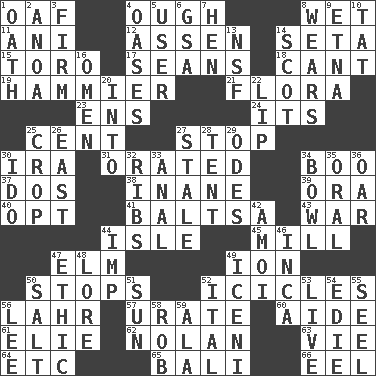 ACROSS 1. Clumsy lout 4. Ending for "Through" and "Enough" 8. Soggy 11. Cuckoo 12. NE Netherlands city 14. Stalk of a moss capsule 15. "Corrida" creature 17. Seines 18. Patter 19. More overdramatic by comparison 21. Plants 23. Followers of ems 24. ___ a Wonderful Life 25. Penny 27. Discontinue 30. Retirement account (abbr.) 31. Spoke pompously 34. Sometimes accompanies a hiss 37. Two (Sp.) 38. Lacking in sense or substance 39. Mouth or opening 40. Choose 41. Greek mezzo-soprano Agnes 43. Armed conflict 44. Capri or Wight 45. Place where flour is made 47. Shade tree 49. Electrically charged atom 50. Discontinues 52. Winter's stalactites 56. Cowardly lion portrayer 57. A salt of uric acid 60. Helper 61. Writer Wiesel 62. Pitcher Ryan 63. Compete 64. And so on (abbr.) 65. Indonesian resort city 66. Snakelike fish DOWN 1. Pledge 2. Small Philippine buffalo 3. Become taut 4. Fertile tracts in a desert 5. One who makes use of a thing 6. Girls' org. (abbr.) 7. Layer 8. Puts on (as clothing) 9. Inactive volcano in Sicily 10. Make lace 13. Overdraft (abbr.) 14. Native of Scotland 16. Sign of things to come 20. To the inside or interior of 22. Mouth edge 25. Riding implement 26. Compass direction 27. Having lost freshness 28. Portable shelter 29. Lyric poems 30. Wedding promise 32. Teases 33. Of or related to the anus 34. Soup holder 35. Spoken 36. Boat paddle 42. Mine, in Marseilles 44. Naughty child 46. South American Indian 47. Principle of right and wrong 48. Old wives' tales, e.g. 49. Ancient Celtic tribe of eastern Britain 50. Table seasoning 51. Player for Phoenix 52. Slanted text style (abbr.) 53. Not recorded 54. Singer Brickell 55. Sew up the eyelids of hawks and falcons 56. Area sheltered from the wind 58. Director Reiner 59. According to