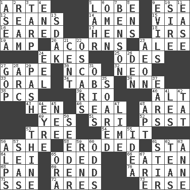 ACROSS 1. Johnson of "Laugh-In" 5. Ear part 9. Compass dir. 12. Seines 14. So be it 15. By way of 16. Having ears or earlike features 17. Coop moms 18. Big collection agency 19. Electrical Unit 20. Oak nuts 23. Toward shelter 24. Supplements with great effort 25. Lyric poems 27. Open wide 30. Non-commissioned officer (abbr.) 32. Modern: prefix 33. Relating to the mouth 34. Bar bills 36. Compass dir. 38. Personal Computers (abbr.) 39. River (Sp.) 40. The first octave above the treble staff 43. Layer 46. Lick closed 48. Length times width 49. Affirmative reply 51. Indian title of respect (Mr.) 52. Inconspicuous attention getter 53. Woody plant 54. Give off 56. American tennis player Robert 58. Worn away 61. R.R. building 64. Flowery wreath 65. Wrote a lyric poem 66. Consumed 68. Baking dish 69. Tear apart 70. Believer in; advocate of (suffix) 71. Compass dir. 72. Ancient Greek god of war 73. Celtic language DOWN 1. At sea 2. 480, 500 or 516 sheets of paper 3. Canvas cover 4. Compass dir. 5. Cowardly lion portrayer 6. Sign of something about to happen 7. Gillaume's butler role 8. Followers of ems 9. Vices 10. Male parent of an animal 11. Relaxation 13. Neighbor of Neb. 21. Penny 22. Motion picture awards 23. A really long time 24. Snakelike fish 26. Lair 27. Grand Old Party 28. Curve 29. Romantic infatuation 31. Off-Broadway awards 35. Flew 37. Hearing organs 41. French article 42. Make lace 44. Jane of fiction 45. Born 47. Citrus frut 48. Fitting 50. Sowing specialist 53. One or ones belonging to thee 55. The content of cognition 56. High mountains 57. Oceans 59. French philosopher Descartes 60. Likelihood 61. Disorderly outburst 62. Afternoon social gatherings 63. Queen of England 1702-14 65. Mouth or opening 67. "We ___ not amused" (Victoria)
