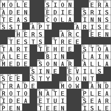ACROSS 1. Undercover agent 5. The Jewish people; Israel 9. Epoch 12. Arabian gulf 13. Singer Brickell 14. Indian titles of respect 15. Beverages made from leaves 16. Root beer relative 17. Lodging establishments 18. Fast jet (abbr.) 19. Fitting 21. Originate 22. Possessive pronoun 24. Curve 26. Car or cant ending 27. Trials 28. Woody plant 29. Small pie 30. Giggle 32. Portico 36. Toward shelter 37. Storage container 38. (Had) reclined 39. Ancient Persian 40. Echolocation 42. Silent film actress Nazimova 43. Trig term 44. Vices 46. Observe 49. Filthy place 50. Do not 51. Exchange 53. Cut the grass 54. Plus 57. Printing process, for short 58. Nathan's nickname 61. Entreaty 62. It may be bright or harebrained 63. Needle holder 64. Wither 65. Fenced enclosure 66. Adolescent 67. Small island DOWN 1. Floor coverings 2. Lyric poems 3. Tough but pliablecoriaceous 4. Followers of ems 5. Religious group 6. Wedding promise 7. Lubricate 8. Teachers' org. 9. Bert's buddy 10. Wash lightly 11. NE Netherlands city 14. Title for a knight 19. Nonscientific branch of learning 20. Inconspicuous attention getter 21. Adept person 23. First name in cosmetics 24. Sports stadium 25. To riddle 27. Falsehood 28. One or ones belonging to thee 29. Scottish cap 31. Black 32. Killed 33. Baron Munchausen's specialties 34. Petroleums 35. Santa ___, CA 40. Be seated 41. Redecorate 43. Compass dir. 45. Promise 46. Long narrow piece of something 47. Wear away 48. Consumed 52. ___ good deed 53. Count _ (2 wds.) 55. Actress Patricia 56. Have the gumption 58. Remaining after all deductions 59. Had dinner 60. Third day of the wk. 61. Air pressure measure (abbr.)