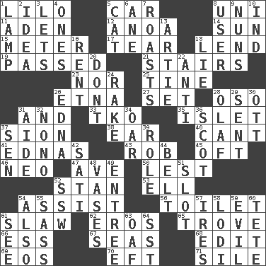 ACROSS 1. _ and Stitch 5. 4-wheeled motor vehicle 8. Corn or form start 11. Arabian gulf 12. Small Philippine buffalo 14. Player for Phoenix 15. Distance measurement 17. Pull apart 18. Grant temporary use of 19. Went by 21. Flight of steps 23. And not 25. Prong on a fork 26. Inactive volcano in Sicily 27. Arrange properly for use 28. Bear (Spanish) 31. Plus 33. Ring climax 35. Small island 37. The Jewish people; Israel 38. Ewer handle 40. Patter 41. Ferber et al. 43. Director Reiner 45. Often (poetically) 46. Modern: prefix 47. "___ Maria" 50. For fear that 52. Comedian Laurel of Laurel & Hardy 53. Pipe bend 54. Aid 56. Bathroom plumbing fixture 61. Cole _ (cabbage dish) 62. Greek god of love 65. Collection of objects 66. Double-curved letter 67. Oceans 68. Prepare for publication 69. Greek goddess of the dawn 70. Newt 71. Drop; flow; fall DOWN 1. Desk light 2. It may be bright or harebrained 3. Allows 4. Washington bills 5. Feline 6. A saturated hydrocarbon 7. Ridicules or criticizes harshly 8. One who uses or employs something 9. Religious women 10. Working for oneself (abbr.) 13. Nick name for Arthur 16. Monthly bill 18. Whopper 20. Do not 22. Opposed to 24. Immoral or dissolute person 26. Pulitzer Prize-winning author Ferber 28. Norwegian king 29. Posted 30. Baseball player Mel 31. Assistant 32. Words to Nanette 34. Boat paddle 36. Highlander 37. Elected rep. 39. Hero or heavy, e.g. 42. Suttee (variant) 44. Waist strap 48. Flower holders 49. Main course 51. Narrow, elongated depression 52. Compass dir. 54. In addition 55. Backtalk 57. Angers 58. Farming town in central California 59. Tending to cause great harm 60. False hair 61. Observe 63. Clumsy lout 64. Fast jet (abbr.)