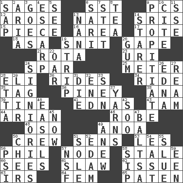 ACROSS 1. Gurus 6. Fast jet (abbr.) 9. Personal Computers (abbr.) 12. Came up 13. Nathan's nickname 14. Indian titles of respect 15. Part 16. Type of rug 17. Carryall 18. White ___ sheet 19. In a ____ (agitated or irritated) 20. Stare wonderingly 21. Round or rotation of duties 23. RI univ. 24. Coast Guard woman 25. Distance measurement 28. Connecticut Ivy Leaguer 30. Amusement-park features 34. Travel on or in a vehicle 35. Label 36. Abounding in pines 38. Santa ___, CA 39. Prong on a fork 41. Ferber et al. 43. Scottish cap 44. Believer in; advocate of (suffix) 46. Loose flowing garment 48. Bear (Spanish) 49. Small Philippine buffalo 50. Group working together 51. Elected reps. 53. French article 56. Silvers or Donahue 57. Thickened enlargement 58. Having lost freshness 60. Perceives with the eye 61. Cole _ (cabbage dish) 62. Come out of 63. Big collection agency 64. Opposite of masc. 65. Eucharist need DOWN 1. Plant excrement 2. Operatic vocal solo 3. Moves 4. Fortification 5. Observe 6. Indian skirt 7. Proofreading order 8. Beverage made from leaves 9. Conciliate 10. Quote 11. Compass dir. 13. Nanny 14. A viewer who gazes fixedly 19. Empty completely 20. Chewing product 22. Rowing implement 24. Seigniories (variant) 26. Pulitzer Prize-winning author Ferber 27. 480, 500 or 516 sheets of paper 28. Singer James 29. Den 31. Pass on 32. Conclusion 33. Elected rep. 37. Tall tales 40. Artist's stands 42. "Barney Miller" actor Jack 45. Immediately 47. Greek mezzo-soprano Agnes 49. Afresh 50. "Mermaids" star 51. Flatfish 52. Dutch treat 54. Compass direction 55. Turn sharply 56. 23rd letter of the Greek alphabet 57. Science/research agcy. 58. Small drink 59. Car or cant ending