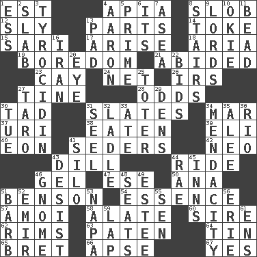 ACROSS 1. Eastern Standard Time (abbr.) 4. Capital of Western Samoa 8. Oscar Madison type 12. Secret 13. Actors' quests 14. Casino tip 15. Indian skirt 17. Ascend 18. Operatic vocal solo 19. Mood resulting from idleness 21. Remained 23. Island 24. Remaining after all deductions 26. Big collection agency 27. Prong on a fork 28. Probability 30. Small boy 31. Chalkboards 34. Third mo. 37. RI univ. 38. Eroded 39. Biblical high priest 40. Period of immesurable duration 41. Spring feasts 42. Modern: prefix 43. Deli pickle 44. Travel on an animal 46. Set 47. Compass dir. 50. Santa ___, CA 51. Gillaume's butler role 54. Center 57. Mine, in Marseilles 58. Having winglike extensions 60. Male parent of an animal 62. Basketball hoops 63. Eucharist need 64. Metal container 65. Cy Young winner Saberhagen 66. Domed church section 67. It is so DOWN 1. Curvy letter 2. Broad, flat, thick piece 3. Polypeptide antibiotic 4. Composer Copland 5. First class 6. It is 7. Toward the sea 8. Flight of steps 9. Nobles 10. Migrant worker of the '30s 11. Necklace unit 13. Writing tablet 16. SW Asia republic 20. Sight organ 22. Auction offers 25. Carrier 27. Pacific island yam 29. Cub Scout units 30. Third day of the wk. 31. Sew up the eyelids of hawks and falcons 32. Dipping utensil 33. Had dinner 34. Ananias' fault 35. Toward shelter 36. River (Sp.) 41. Grain storage tower 43. Stop 44. Actress Charlotte 45. Restaurants 46. Dwarf 48. Theater features 49. First name in cosmetics 51. Sharp remark 52. Arab leader 53. California wine valley 55. Elected rep. 56. 4th largest of the Great Lakes 59. Infant locale 61. Followers of ems