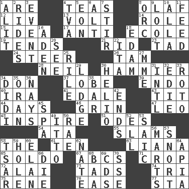 ACROSS 1. "We ___ not amused" (Victoria) 4. Afternoon social gatherings 8. Norwegian king 12. 54 in ancient Rome 13. Electrical Unit 14. Hero or heavy, e.g. 15. The main thing one is thinking about 17. Opposed to 18. Learning spot: Fr. 19. Is inclined (to) 21. To free from 23. Small amount or degree 24. Navigate 26. Scottish cap 28. Famous astronaut Armstrong 30. More given to overacting 34. Spanish title 37. Ear part 39. Inside; within (prefix) 40. Lyricist Gershwin 41. Peak District village in England 43. Teat (slang) 44. 24-hour periods 46. Broad smile 47. Lion 48. Stimulate to action 51. Lyric poems 54. "One Day ___ Time" 55. Shuts with force 58. Definite Article 61. Nine, plus one 63. Climbing, woody, usually tropical vines 65. Twentieth part of a lira 67. Lettered men learn these first 71. Riding implement 72. Mountain range southwest of Kyrgyzstan 73. Small boys 74. Three (prefix) 75. French philosopher Descartes 76. Comfort 77. R.R. building DOWN 1. Came down and settled, as after flight 2. Amusement-park features 3. Incident 4. Federal power corp. 5. Period of immesurable duration 6. The first octave above the treble staff 7. Tumult 8. The grampus (Milton) 9. Plunder 10. Silent film actress Nazimova 11. Nourish 16. Arabian gulf 18. Dutch treat 20. Perceive with the eye 22. Call ___ day 25. Cause heat under the collar 27. Madame (abbr.) 29. Inn 30. Sun: prefix 31. International (abbr.) 32. Singer Brickell 33. Printing process, for short 34. "You Light Up My Life" star Conn 35. Northwest Algerian city 36. Negative votes 38. Tavern 42. Conclusions 45. Health resort 49. "Tell ____ the Marines!" 50. Actress Charlotte 52. Pipe bend 53. Ketch in the Levant 56. Shops 57. Derisive sound 58. Russian ruler of old 59. Hollow 60. Liveliness 62. Nathan's nickname 64. Capital of Western Samoa 66. Expire 68. Sound made by sheep 69. Music discs 70. Compass dir.