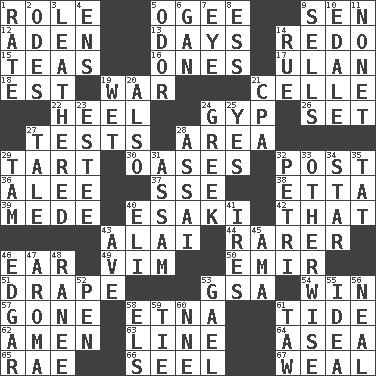 ACROSS 1. Hero or heavy, e.g. 5. Double curve, resembling the letter S 9. Elected rep. 12. Arabian gulf 13. 24-hour periods 14. Make new 15. Beverages made from leaves 16. Singles 17. Uhlan (variant) 18. Eastern Standard Time (abbr.) 19. Armed conflict 21. Cell (Danish) 22. The bottom of a shoe or boot 24. Con 26. Arrange properly for use 27. Trials 28. Type of rug 29. Small pie 30. Fertile tracts in a desert 32. Mail 36. Toward shelter 37. Compass dir. 38. Singer James 39. Ancient Persian 40. 1973 Nobel Price Winner (Physics) Leo 42. Not this but _ 43. Jai _ 44. More uncommon 46. Ewer handle 49. Zeal 50. Arab leader 51. Window treatment 53. Girls' org. (abbr.) 54. Acquire through effort 57. Went 58. Inactive volcano in Sicily 61. Event that recurs at intervals 62. So be it 63. Actor's bit 64. Toward the sea 65. Actress Charlotte 66. Sew up the eyelids of hawks and falcons 67. Welt DOWN 1. Assign a rank or rating to 2. Lyric poems 3. Resembling or made to resemble leather 4. Followers of ems 5. Aroma 6. Separate the seeds from cotton 7. Sight organ 8. Curvy letter 9. Makes a sale 10. Peak District village in England 11. Music written for nine 14. Regret 19. Soggy 20. In addition 21. Accounting whiz (abbr.) 23. First name in cosmetics 24. Hellenic 25. It is so 27. Falsehood 28. Slender Brazilian palm 29. Scottish cap 31. Indian state 32. _ dish (used to culture cells) 33. Else 34. Play the lead 35. Make lace 40. Biblical high priest 41. Angers 43. "___ Maria" 45. Wet nurse (var.) 46. _ Allan Poe 47. Scent 48. The wife of a rajah (variant) 52. Animal enclosure 53. Highlander 55. The main thing one is thinking about 56. Be tempered by heat 58. Raised railways 59. Standoff 60. Compass dir. 61. The 23rd letter of the Hebrew alphabet