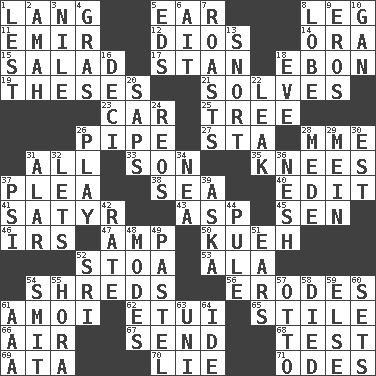 ACROSS 1. Long (Scottish) 5. Ewer handle 8. Part of a journey 11. Arab leader 12. "Vaya con ____" 14. Mouth or opening 15. First course 17. Comedian Laurel of Laurel & Hardy 18. Inky black, to poets 19. College papers 21. Finds the solution 23. 4-wheeled motor vehicle 25. Family _ (genealogy) 26. Corncob 27. R.R. building 28. Madame (abbr.) 31. Everything 33. Manchild 35. Leg joints 37. Entreaty 38. Ocean 40. Prepare for publication 41. Man with strong sexual desires 43. Viper 45. Elected rep. 46. Big collection agency 47. Electrical Unit 50. Malaysian steamed pastry 52. Portico 53. Chicken ___ king 54. Fragments 56. Eats (away) 61. Mine, in Marseilles 62. Needle holder 65. Vertical member of a panel or frame 66. Wind 67. Transmit 68. Trial 69. _ moment's notice (2 wds.) 70. Falsehood 71. Lyric poems DOWN 1. For fear that 2. Nursemaid 3. "Death on the ____" 4. Pate de foie ____ 5. Begley and Asner 6. Small island 7. Cooks with dry heat, as in an oven 8. Ear part 9. Greek god of love 10. Separate the seeds from cotton 13. Derisive sound 16. Tenth: prefix 18. First lady 20. Plant excrements 22. Path through which fluid escapes 24. Vintage cars 26. Shaw product 28. Ancient Persian 29. Count _ (2 wds.) 30. Eastern Standard Time (abbr.) 31. Having or resembling wings 32. Allows 34. Teachers' org. 36. Soft 37. Air pressure measure (abbr.) 39. "____ silly question..." 42. Pace 44. Whimper 48. Methods 49. Soft color 51. Hearing organs 52. _ Lanka 54. Stricken, poetically 55. Israeli folk dance 57. "Beetle Bailey" pooch 58. Passed on 59. Otherwise 60. Arranges properly for use 61. American Automobile Association (abbr.) 63. Corn or form start 64. Binary compound