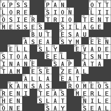 ACROSS 1. Global Positioning Systems (abbr.) 5. Baking dish 8. Baseball player Mel 11. Old wives' tales, e.g. 12. The Jewish people; Israel 14. Cards in a Roman deck? 15. Flexible twig of a willow tree 17. Musical group of three 18. Portable shelter 19. Makes clutter 21. Fodder prepared in a silo 23. Yet 25. Son of Isaac 26. At sea 27. Symbol (abbr.) 28. Car or cant ending 31. Pipe bend 33. Mischievous 35. Elude 37. Portico 38. Snakelike fish 40. Is not 41. Lacking in sense or substance 43. Plant excrement 45. _ moment's notice (2 wds.) 46. Scottish cap 47. Compass dir. 50. Ardor 52. Silent film actress Nazimova 53. Erode 54. Sunflower state 56. Lover boys 61. Painter Guido (1575-1642) 62. Beverages made from leaves 65. Haggard of country music 66. Layer 67. Narrow board 68. Mediterranean tributary 69. Single 70. Declare 71. Lick closed DOWN 1. Seize upon or latch onto something 2. Airs 3. Indian titles of respect 4. Perceives with the eye 5. Pacific Standard Time (abbr.) 6. Atmosphere 7. Annoying sounds 8. Cassini of fashion 9. Prong on a fork 10. Teat (slang) 13. Annoyingly loud 16. Confederate soldiers (slang) 18. The 19th letter of the Greek alphabet 20. Takes to court 22. Unable to walk 24. Falsehood 26. Actor Alda or Thicke 28. 90 degrees 29. Pulitzer Prize-winning author Ferber 30. Fish or hair follower 31. Inactive volcano in Sicily 32. Rich soil 34. It is so 36. Small bottle 37. Be seated 39. Goldbrick 42. Snakelike fish 44. Lightbulb-shaped fruit 48. Narrow boards 49. Artist's stands 51. Tiny particle 52. Cuckoo 54. Peachy ____! 55. Singer Murray 57. Not women's 58. One of the Great Lakes 59. Water jar 60. Sew up the eyelids of hawks and falcons 61. 17th letter of the Greek alphabet 63. American Automobile Association (abbr.) 64. Filthy place