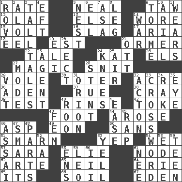 ACROSS 1. Assign a rank or rating to 5. Be tempered by heat 9. The 23rd letter of the Hebrew alphabet 12. Norwegian king 13. Otherwise 14. Had on 15. Electrical Unit 16. Volcanic refuse 17. Operatic vocal solo 18. Snakelike fish 19. Eastern Standard Time (abbr.) 21. Channel Islands abalone 22. Lie 24. Krazy ___ of comics 26. Raised railways 27. Mysterious quality of enchantment 28. In a ____ (agitated or irritated) 29. Short-tailed, large-bodied rat 30. Carrier 32. Land measure 36. Arabian gulf 37. Sorrow 38. Supercomputer manufacturer 39. Trial 40. Remove soap 42. Casino tip 43. Lowest support of a structure 44. Came up 46. Viper 49. A really long time 50. Without 51. Excessive but superficial compliments 53. Slangy assent 54. Soggy 57. "Two Mules for Sister ____" 58. Writer Wiesel 61. Thickened enlargement 62. Johnson of "Laugh-In" 63. Famous astronaut Armstrong 64. One of the Great Lakes 65. It is 66. Land 67. Locale of original sin DOWN 1. Be footloose 2. _ vera 3. Baron Munchausen's specialties 4. Bank Draft (abbr.) 5. Egg locale 6. Pipe bend 7. White ___ sheet 8. Part of a journey 9. Singer Mel 10. Satellite of Uranus 11. Erodes 14. Armed conflict 19. Biblical high priest 20. Religious group 21. Baseball player Mel 23. Rep 24. Leg joints 25. Atmosphere 27. Method 28. Difficult or unusual or dangerous feat 29. Large container 31. Greek mythologigal hunter 32. NE Massachussets city 33. What you're doing now 34. Immoral or dissolute person 35. Sight organ 40. Friend of Pooh 41. Relaxation 43. Opposite of masc. 45. Strike 46. Slender Brazilian palm 47. Don Adams' spy role 48. Pieces 52. Actress Charlotte 53. Shout 55. Singer Brickell 56. Adolescent 58. Followers of ems 59. Lion 60. One more than two 61. Born
