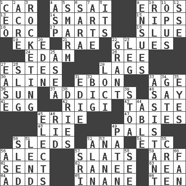 ACROSS 1. 4-wheeled motor vehicle 4. Slender Brazilian palm 9. Greek god of love 13. Environmental prefix 14. Don Adams' spy role 15. Pinches, bites 16. The grampus (Milton) 17. Components 18. Turn sharply 19. Make supply last 21. Actress Charlotte 22. Cements 24. Dutch treat 26. To sift 27. _____ Park, CO 29. Fails to keep up a pace 30. Place in a line 31. Inky black, to poets 33. Grow older 36. Player for Phoenix 37. Inveterate users 40. Declare 41. Oval reproductive body of a fowl 42. Swiss mountan, "Queen of the Mountains" 43. Clothes sense 45. One of the Great Lakes 47. Off-Broadway awards 48. Untruth 49. Friends 50. Bobsleighs 52. Santa ___, CA 54. And so on (abbr.) 56. Actor Baldwin 57. Narrow boards 59. Sandy's bark 61. Posted 62. Indian princess (variant) 63. Teachers' org. 64. Does sums 65. Silly 66. Nine, plus one DOWN 1. Corporate head (abbr.) 2. 43,560 square feet 3. Shooting up abruptly 4. Viper 5. Excessive but superficial compliments 6. "Two Mules for Sister ____" 7. Johnson of "Laugh-In" 8. ___ a Wonderful Life 9. Follows as a consequence or result 10. Cause heat under the collar 11. Musical composition 12. Compass dir. 20. Paradise 22. Let have 23. Part of a journey 25. Toward the sea 27. Comfort 28. A hard, heavy blow 29. Locales 31. Singer Brickell 32. Large 33. Helper 34. Yard entry 35. Snake ____ (dice throw) 38. Frees from moisture 39. Portico 44. Competent 45. Opts 46. To free from 49. Eucharist need 50. Downhill vehicle 51. Grant temporary use of 52. Actor Alda or Thicke 53. Grandmother 55. Algonquian 56. White ___ sheet 57. Indian title of respect (Mr.) 58. Observe 60. Air blower