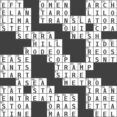 ACROSS 1. Bank Draft (abbr.) 4. Presage 8. Bowlike part 12. Enthusiasm 14. Edible starchy tuberous root 15. _ and Stitch 16. Pale green bean 17. Interpreter 20. Proofreading order 21. Fr. "Yes" 22. Accounting whiz (abbr.) 23. Father Junipero _ 27. Tender 29. Land elevation 31. Event that recurs at intervals 34. Cowboy competition 35. Vintage cars 36. Relaxation 39. Police officer (slang) 41. Is not 42. Pismires 43. _____ steamer (cargo ship) 46. Small pie 47. Male parent of an animal 48. Toward the sea 51. Paris' subway 54. Make lace 56. R.R. building 58. SW Asia republic 61. Pleas 66. Have the gumption 67. Portico 68. Mouths or openings 69. Singer James 70. Prong on a fork 71. Female horse 72. Snakelike fish DOWN 1. Snakelike fish 2. Secret move to avoid paying debts 3. Corrects by punishment or discipline 4. Baseball player Mel 5. Impair 6. Epoch 7. Words to Nanette 8. Chicken ___ king 9. Actors Guy, Robert Welles, and Clint 10. Hoof sound 11. Israeli folk dance 13. Nathan's nickname 18. Player for Phoenix 19. Falsehood 24. 17th letter of the Greek alphabet 25. To free from 26. Actor Baldwin 28. Remove all contents or possession from 30. Plunders 32. Spanish title 33. Eastern Standard Time (abbr.) 34. Musical pauses 36. Consume 37. Santa ___, CA 38. Ski resort town in Vermont 40. Demure 44. "We ___ not amused" (Victoria) 45. Was introduced to 49. Compass dir. 50. _ moment's notice (2 wds.) 52. Travel on an animal 53. Speak pompously 54. Trial 55. Against 57. Tiny particle 59. Johnson of "Laugh-In" 60. Be tempered by heat 62. Actress Charlotte 63. Lyricist Gershwin 64. Hearing organ 65. Compass dir.