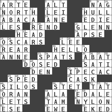 ACROSS 1. Johnson of "Laugh-In" 5. The first octave above the treble staff 8. Tired old horse 11. 0 degrees 13. Luau accessory 14. Frame or body of a ship 15. Phillipine bananalike plant 16. A saturated hydrocarbon 17. Singer Brickell 18. French article 19. Tear apart 21. American astronaut and politician John 22. Froth on beer 24. Domed church section 25. Motion picture awards 27. Area sheltered from the wind 29. Hitchcock's "____ Window" 30. Phone greeting 32. Singer Murray 33. Arguments over trivial matters 35. Blind as ____ 39. Administered medicine 41. Suttee (variant) 42. Lair 43. Medicinal drug used to evoke vomiting 45. Moved rapidly 48. Keg 49. Grain storage towers 50. Proofreading order 52. Make lace 55. NW Algerian seaport 56. According to 57. Peak District village in England 59. Allows 60. Scottish cap 61. Thermoplastic polyamide 62. Compass dir. 63. She-sheep 64. Supplemented with great effort DOWN 1. Of or related to the anus 2. Loose flowing garment 3. File 13 4. And so on (abbr.) 5. Actor Alda or Thicke 6. Grant temporary use of 7. Make a knot 8. Unclothed pictures 9. Place in a line 10. Small, secluded valley 12. Ethiopian city, capital of Harari 14. Aid 20. Begley and Asner 21. Highlander 23. Having ears or earlike features 25. Mouth or opening 26. Elected rep. 27. Allow 28. Raised railways 30. Possessed 31. Fertile tracts in a desert 33. Compass dir. 34. Animal enclosure 36. Sass 37. _ moment's notice (2 wds.) 38. Nervous spasm 40. Probability 43. Frozen water 44. Eucharist need 45. Fathers 46. Food holder 47. Immeasurably long periods of time 49. Flatfish 50. Cole _ (cabbage dish) 51. Not wild 53. Medicinal plant 54. Watch over 56. Had dinner 58. Color