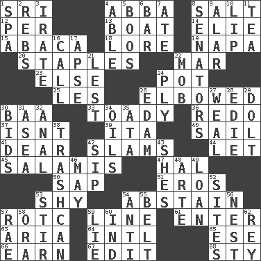 ACROSS 1. Indian title of respect (Mr.) 4. Swedish rock group 8. Table seasoning 12. For each 13. Water vessel 14. Writer Wiesel 15. Phillipine bananalike plant 18. Old wives' tales, e.g. 19. California wine valley 20. Paper fasteners 22. Spoil 23. Otherwise 24. Cooking vessel 25. French article 26. Turned at an angle; bent 30. Sound made by sheep 33. Sycophant 36. Do over again 37. Is not 39. Call ___ day 40. Move on water 41. Letter starter 42. Hits or strikes with great force 44. Allow 45. Deli grouping 47. Actor Linden 50. Plant excrement 51. Greek god of love 53. Like a shrinking violet 54. Refrain by choice 57. College mil. group 59. Actor's bit 61. Keyboard key 63. Operatic vocal solo 64. International (abbr.) 65. Compass dir. 66. Merit 67. Prepare for publication 68. Filthy place DOWN 1. Health resort 2. Confederate soldiers (slang) 3. Feeling or showing extreme anger 4. Competent 5. Scornful sounds 6. Long, evenly shaped piece 7. Had dinner 8. Legislators 9. Having or resembling wings 10. Mouth edge 11. Afternoon social gathering 16. Give a ring to 17. Domed church section 21. For fear that 22. Disorderly crowd 24. Apply oneself diligently 26. Dutch treat 27. Welt 28. Singer Brickell 29. Dunce 30. Auction offers 31. Toward the sea 32. Of or related to the anus 34. Petroleums 35. "One Day ___ Time" 38. File 13 42. Small drink 43. "______ My Girl" (Turtles hit) 46. Can I? 48. Johnson of "Laugh-In" 49. Grant temporary use of 52. Settings 53. Use a swizzle stick 54. Opposed to 55. Waist strap 56. Egg locale 57. Actress Charlotte 58. Mouth or opening 59. Whopper 60. Working for oneself (abbr.) 62. Marina Del _, California