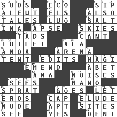 ACROSS 1. Soap bubbles 5. Environmental prefix 8. Small drink 11. Native American of Southwest Alaska 13. Raised railways 14. In addition 15. Lies 16. Nilotic language 17. Table seasoning 18. _ tizzy (2 wds.) 19. Domed church section 21. Atmospheres 22. Bits 24. Patter 25. Bathroom 27. Insect wing 29. Small Philippine buffalo 30. Sports stadium 32. Portable shelter 33. Proofreads 35. Wise men 39. Make improvements or corrections to 41. Collude with 42. Santa ___, CA 43. Annoying sounds 45. Perceives with the eye 48. Billionth: prefix 49. Small fatty European fish 50. Moves 52. Allow 55. Greek god of love 56. Head covering 57. Evade 59. Unadorned 60. Fitting 61. Settings 62. Observe 63. Consenting reply 64. Undesirable depression on a surface DOWN 1. Suttee (variant) 2. ____ Bator 3. Accusation by an informer 4. Take to court 5. Snakelike fish 6. A slight indication 7. Bear (Spanish) 8. Killed 9. Small island 10. Plant holders 12. Sadhe (variant) 14. "____ silly question..." 20. Pacific Standard Time (abbr.) 21. Glance over 23. Having winglike extensions 25. Make lace 26. Single 27. Nonscientific branch of learning 28. French article 30. Help 31. At full speed 33. Car or cant ending 34. Heredity factor (abbr.) 36. Utter; complete 37. Unit of force equal to gravity 38. It is 40. Vertical spar for supporting sails 43. Compass dir. 44. Fertile tracts in a desert 45. Upset 46. Wear away 47. Comfort 49. Elected reps. 50. Stare wonderingly 51. Chooses 53. Locale of original sin 54. Trial 56. Island 58. Flaplike covering