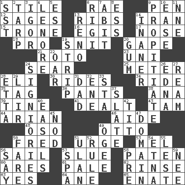 ACROSS 1. Vertical member of a panel or frame 6. Actress Charlotte 9. Writing instrument 12. Gurus 13. Chest bones 14. SW Asia republic 15. Marketplace scale 16. The front part of a cuirass 17. Olfactory organ 18. Adept person 19. In a ____ (agitated or irritated) 20. Open wide 21. Printing process, for short 23. Single; one (prefix) 24. Shrivel 25. Distance measurement 28. Connecticut Ivy Leaguer 30. Amusement-park features 34. Travel on or in a vehicle 35. Label 36. Leg coverings 38. Santa ___, CA 39. Prong on a fork 41. Started a card game 43. Scottish cap 44. Believer in; advocate of (suffix) 46. Assistant 48. Bear (Spanish) 49. "Beetle Bailey" pooch 50. Flintstone 51. Goad 53. Cartoonist voice _ Blanc 56. Move on water 57. Change direction abruptly 58. Eucharist need 60. Ancient Greek god of war 61. Diluted with white 62. Wash lightly 63. Affirmative reply 64. One (Scot) 65. Related on the mother's side DOWN 1. Fast jet (abbr.) 2. Canvas cover 3. Composer Stravinsky 4. Poe poem 5. Compass dir. 6. Swiss mountan, "Queen of the Mountains" 7. "This won't hurt ____!" 8. Curvy letter 9. Appease 10. Comfort 11. Compass dir. 13. Western Nevada city 14. More empty; more void 19. Remove all contents or possession from 20. Chewing product 22. Rowing implement 24. Seigniories (variant) 26. Pulitzer Prize-winning author Ferber 27. 480, 500 or 516 sheets of paper 28. Singer James 29. Den 31. Male parent 32. Compass dir. 33. R.R. building 37. Chalkboard 40. Artist's stands 42. Teat (slang) 45. Dreamland 47. Kingdom 49. Double curve, resembling the letter S 50. Conductor's collection 51. ____ Bator, Mongolia 52. Governing power 54. Inactive volcano in Sicily 55. For fear that 56. Declare 57. Health resort 58. Before (prefix) 59. Born