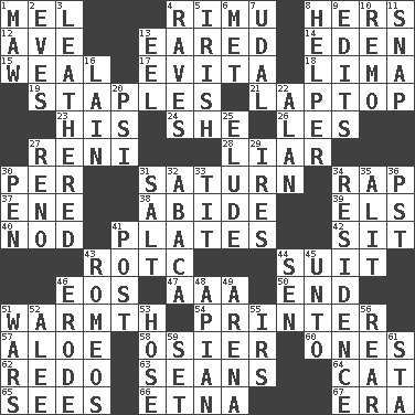 ACROSS 1. Cartoonist voice _ Blanc 4. Tall New Zealand timber tree 8. Possessive pronoun 12. "___ Maria" 13. Having ears or earlike features 14. Locale of original sin 15. Welt 17. Webber/Rice musical 18. Pale green bean 19. Paper fasteners 21. Portable computer 23. Part of HMS, perhaps 24. A female animal or person 26. French article 27. Painter Guido (1575-1642) 28. One who doesn't tell the truth 30. For each 31. Titan orbits this 34. Reproach for some lapse or misdeed 37. Compass dir. 38. Stay 39. Raised railways 40. Allow head to fall sleepily 41. Food holders 42. Be seated 43. College mil. group 44. Costume for a special activity 46. Greek goddess of the dawn 47. Auto club (abbr.) 50. Conclude 51. Heat 54. Hard copy producer 57. _ vera 58. Flexible twig of a willow tree 60. Washington bills 62. Redecorate 63. Actors Connery and Penn 64. Feline 65. Perceives with the eye 66. Inactive volcano in Sicily 67. Epoch DOWN 1. Informal term for the mouth 2. Nights before holidays 3. Tough but pliablecoriaceous 4. All-night dance parties 5. From or relating to Ireland 6. Was introduced to 7. Allodial 8. Aide 9. Prepares for publication 10. San ____ (Riviera town) 11. Fastener 13. Snakelike fish 16. (Had) reclined 20. Air pressure measure (abbr.) 22. Actor Alda or Thicke 25. Dodge 27. Western Nevada city 29. Angers 30. Fenced enclosure 31. Table seasoning 32. Phillipine bananalike plant 33. Teat (slang) 34. Home 35. Came down and settled, as after flight 36. Pacific Standard Time (abbr.) 41. Mail 43. Lover boys 44. Elected rep. 45. To (old English) 46. Wear away 48. Bee-related 49. Sports stadium 51. Armed conflicts 52. Toward shelter 53. Stockings 55. Big collection agency 56. Hitchcock's "____ Window" 59. Arrange properly for use 61. R.R. building