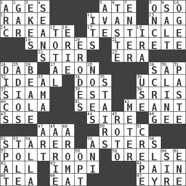 ACROSS 1. Grows older 5. Had dinner 8. Bear (Spanish) 11. Libertine 12. "Terrible" tsar 13. Tired old horse 14. Make 17. One of the two male reproductive glands 19. Sounds asleep 21. Cylindrical with tapered ends 22. Disorderly outburst 23. Epoch 24. Small moist lump or mass 27. A really long time 29. Plant excrement 32. Perfect 34. Two (Sp.) 36. Southern CA. univ. 37. Thailand, formerly 38. Eastern Standard Time (abbr.) 39. Indian titles of respect 40. Root beer relative 41. Ocean 42. Intended 43. Compass dir. 44. Father 46. Unit of force equal to gravity 47. Auto club (abbr.) 50. College mil. group 52. A viewer who gazes fixedly 55. Michaelmas daisies 57. Characterized by complete cowardliness 59. Threatening words 62. 100% 63. Body of Kaffir warriors 64. Ache 65. Afternoon social gathering 66. Erode 67. Jane of fiction DOWN 1. Curve 2. Slender fish 3. Supplements with great effort 4. Seines 5. "___ Maria" 6. Clothes sense 7. Keyboard key 8. At one time in the past 9. Table seasoning 10. Double curve, resembling the letter S 12. ___ a Wonderful Life 15. "_____ Recall" 16. 4th largest of the Great Lakes 18. Lyricist Gershwin 20. Eats (away) 24. Plates 25. Goodbye (Sp.) 26. Calif. Air Force Base 28. Olfactory organs 29. Strangle with an iron collar 30. Place in a line 31. Thick mixture 33. Nursemaid (var.) 35. Flight of steps 36. Purpose 42. Distance measurement 45. Printing process, for short 47. Nonscientific branch of learning 48. Nest on high 49. Scent 51. Streamer paper 52. Argument over a trivial matter 53. Lacquered or enameled metalware 54. Silent film actress Nazimova 55. Black tropical American cuckoo 56. Kill 58. Elect 60. Title for a knight 61. Compass dir.