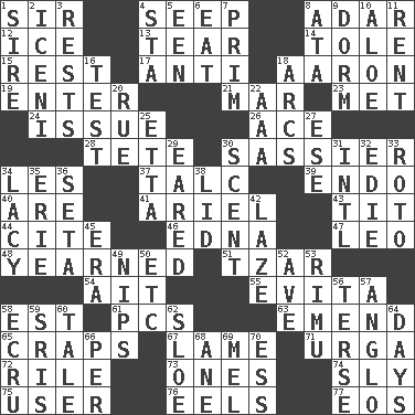 ACROSS 1. Title for a knight 4. Ooze 8. The sixth month of the Jewish calendar 12. Frozen water 13. Lacerate 14. Lacquered or enameled metalware 15. State of inaction 17. Opposed to 18. Composer Copland 19. Keyboard key 21. Third mo. 23. Was introduced to 24. Come out of 26. Adept person 28. Wig 30. More lively and spirited 34. French article 37. Baby powder 39. Inside; within (prefix) 40. "We ___ not amused" (Victoria) 41. Satellite of Uranus 43. Teat (slang) 44. Quote 46. Pulitzer Prize-winning author Ferber 47. Lion 48. Had a strong desire 51. Russian ruler 54. Small island 55. Webber/Rice musical 58. Eastern Standard Time (abbr.) 61. Personal Computers (abbr.) 63. Make improvements or corrections to 65. Dice game 67. Unable to walk 71. Capital and largest city of Mongolia 72. Cause heat under the collar 73. Washington bills 74. Secret 75. One who makes use of a thing 76. Snakelike fish 77. Greek goddess of the dawn DOWN 1. Beget 2. Ancient Celtic tribe of eastern Britain 3. Musical pauses 4. R.R. building 5. Car or cant ending 6. Ingest 7. Demure 8. "One Day ___ Time" 9. Dormintory (informal) 10. _ vera 11. Monthly bill 16. Trial 18. Curves 20. Sorrow 22. American Automobile Association (abbr.) 25. Singer James 27. Compass dir. 29. Having ears or earlike features 30. Aroma 31. International (abbr.) 32. Singer Brickell 33. Printing process, for short 34. Made of lace 35. One of the Great Lakes 36. Stalk of a moss capsule 38. Hat (slang) 42. Goldbrick 45. Period 49. Cuts off 50. And so on (abbr.) 52. "___ Maria" 53. Tall New Zealand timber tree 56. Laconic 57. White American of non-Hispanic descent 58. Shade of tan 59. Indian titles of respect 60. Story 62. _ gin 64. 24-hour periods 66. For each 68. One (Scot) 69. Cartoonist voice _ Blanc 70. Curvy letter