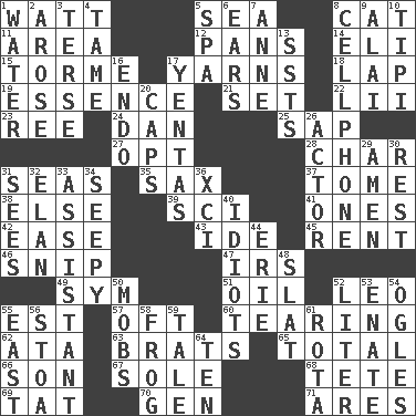 ACROSS 1. Electrical Unit 5. Ocean 8. Feline 11. Type of rug 12. Baking dishes 14. Biblical high priest 15. Singer Mel 17. Tall tales 18. Pet locale 19. Substance 21. Put into a specified state 22. Cards in a Roman deck? 23. To sift 24. One of the 12 tribes of Israel 25. Plant excrement 27. Elect 28. Burn to charcoal 31. Oceans 35. Saxophone 37. Heavy book 38. Otherwise 39. _-fi 41. Washington bills 42. Relaxation 43. Binary compound 45. Monthly bill 46. Sever or remove by pinching or nipping 47. Big collection agency 49. Symbol (abbr.) 51. Lubricate 52. Lion 55. Eastern Standard Time (abbr.) 57. Often (poetically) 60. Rending 62. "One Day ___ Time" 63. Naughty children 65. Add up to 66. Manchild 67. Flatfish 68. Wig 69. Make lace 70. Commissioned mil. rank 71. Ancient Greek god of war DOWN 1. Wetness 2. Came up 3. Laconic 4. Docile 5. Health resort 6. Hearing organs 7. Queen of England 1702-14 8. Portable communications device 9. Mountain range southwest of Kyrgyzstan 10. Native american tent (variation) 13. Fast planes 16. Inside; within (prefix) 17. Gossips 20. Balmoral and tarboosh 26. Thespian 29. So be it 30. State of inaction 31. Perceives with the eye 32. Style 33. Helper 34. Not well drained, as in land 36. One more than ninety 40. Foolish or stupid persons 44. One of the Great Lakes 48. Narrow board 50. Disorderly crowds 52. 61 cubic inches 53. Maternal 54. Stares at amorously 55. Compass direction 56. Portico 58. Tree-dwelling hopper 59. Story 61. Round or rotation of duties 64. Nine, plus one