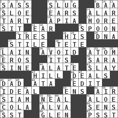 ACROSS 1. Backtalk 5. Strike heavily 9. Sound made by sheep 12. A type of plum 13. Hearing organs 14. Having or resembling wings 15. Small pie 16. Capital of Western Samoa 17. Greater amount 18. Be seated 19. Ewer handle 21. Soup utensil 22. Angers 24. Part of HMS, perhaps 26. Heredity factor (abbr.) 27. Vertical member of a panel or frame 28. False hair 29. (Had) reclined 30. Prevent the occurrence of 32. Smallest unit of an element 36. Greek god of love 37. ___ a Wonderful Life 38. "Two Mules for Sister ____" 39. Trig term 40. Having winglike extensions 42. Kill 43. Land elevation 44. Allots cards 46. Male parent 49. "One Day ___ Time" 50. Prepare for publication 51. Standard of perfection 53. Followers of ems 54. Atmosphere 57. Thailand, formerly 58. Anneal 61. _ vera 62. Root beer relative 63. Inventor's middle name 64. Elected reps. 65. Fast jet (abbr.) 66. Small, secluded valley 67. Inconspicuous attention getter DOWN 1. Fast planes 2. Jai _ 3. Conclusion 4. Put into a specified state 5. Singe 6. Pet locale 7. RI univ. 8. Girls' org. (abbr.) 9. Vital fluid 10. Composer Copland 11. Sports stadium 14. Electrical Unit 19. Snakelike fish 20. Toward the sea 21. Compass dir. 23. Wash lightly 24. Robbery 25. It would 27. Indian skirt 28. Add up to 29. French article 31. Country estate 32. Slender Brazilian palm 33. Baron Munchausen's specialties 34. Mouths or openings 35. Can I? 40. Small island 41. Locale of original sin 43. Actor Linden 45. Begley and Asner 46. Plates 47. Goodbye (Sp.) 48. Started a card game 52. Nursemaid (var.) 53. Flair 55. Charged atoms 56. Relief 58. Tired old horse 59. Pipe bend 60. "___ Maria" 61. Cleo's killer