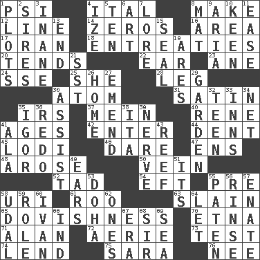 ACROSS 1. 23rd letter of the Greek alphabet 4. Slanted text style (abbr.) 8. Cause to be 12. Actor's bit 14. Nothings 16. Type of rug 17. NW Algerian seaport 18. Pleas 20. Looks after 22. Ewer handle 23. One (Scot) 24. Compass dir. 25. A female animal or person 28. Part of a journey 30. Smallest unit of an element 31. Smooth fabric 35. Big collection agency 37. Count _ (2 wds.) 40. French philosopher Descartes 41. Ripens 42. Keyboard key 44. Undesirable depression on a surface 45. Farming town in central California 46. Have the gumption 47. Followers of ems 48. Came up 50. Distinctive style or manner 52. Bit 54. Newt 55. Before (prefix) 58. RI univ. 61. Friend of Pooh 63. Killed 65. Innocence, gentleness, or tenderness 70. Inactive volcano in Sicily 71. Actor Alda or Thicke 72. Nest on high 73. Trial 74. Grant temporary use of 75. "Two Mules for Sister ____" 76. Born DOWN 1. Small pieces of grounds 2. Begets 3. Lacking in sense or substance 4. Ending with capital 5. "___ Little Indians" 6. Tate display 7. Old wives' tales, e.g. 8. Floor protector 9. Roberta Peters solo 10. Peachy ____! 11. Relaxation 13. Conclude 15. Lick closed 19. Ancient Greek god of war 21. Fast jet (abbr.) 26. Dwelling 27. Make improvements or corrections to 29. Place where plants grow 30. Aid 32. Adolescent 33. Lodging establishments 34. Fish or hair follower 35. Composer Stravinsky 36. Make new 38. Call ___ day 39. Effrontery 41. Insect wing 43. Coral collection 49. Hearing organs 51. ___ a Wonderful Life 53. Capital of the state of Qatar 55. Eucharist need 56. Remove soap 57. Maternal 58. Freehold land 59. Hero or heavy, e.g. 60. _ the terrible 62. Washington bills 64. Allow 66. Working for oneself (abbr.) 67. Epoch 68. Title for a knight 69. Ocean