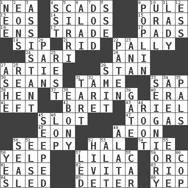 ACROSS 1. Teachers' org. 4. Large numbers or amounts 9. Whimper 13. Greek goddess of the dawn 14. Grain storage towers 15. Mouths or openings 16. Followers of ems 17. Exchange 18. Writing tablets 19. Small drink 21. To free from 22. Chummy 24. Indian skirt 26. Black tropical American cuckoo 27. Nick name for Arthur 29. Comedian Laurel of Laurel & Hardy 30. Actors Connery and Penn 31. Not wild 33. Plant excrement 36. Layer 37. Pulling apart 40. Epoch 41. Newt 42. Cy Young winner Saberhagen 43. Satellite of Uranus 45. Position in a hierarchy or organization 47. Ancient Roman robes 48. Period of immesurable duration 49. Period of immesurable duration 50. Not well drained, as in land 52. Actor Linden 54. Make a knot 56. Sharp bark 57. Pale purple color 59. The grampus (Milton) 61. Comfort 62. Webber/Rice musical 63. River (Sp.) 64. Downhill vehicle 65. Prevent from occurring 66. Slangy assent DOWN 1. Born 2. Immeasurably long periods of time 3. Aide 4. Fast jet (abbr.) 5. High-altitude cloud 6. Mountain range southwest of Kyrgyzstan 7. Texas town _ City 8. Compass dir. 9. Cotton for raincoats, e.g. 10. Mountain range 11. Kenny Rogers chart-topper in '80 12. Double-curved letter 20. Ache 22. Eucharist need 23. Santa ___, CA 25. Repose 27. American tennis player Robert 28. Coral ridge 29. Stricken, poetically 31. Small pie 32. "We ___ not amused" (Victoria) 33. Signiory (variant) 34. Length times width 35. Friends 38. Black 39. Yard entry 44. Carrot, for example 45. Oozed 46. Chop off 49. Having winglike extensions 50. Lick closed 51. Otherwise 52. Hub of activity 53. Came down and settled, as after flight 55. One of the Great Lakes 56. Consenting reply 57. Directed 58. Auto 60. Police officer (slang)