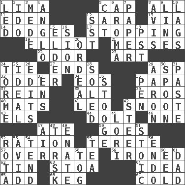 ACROSS 1. Pale green bean 5. Head covering 8. Everything 11. Genesis locale 12. "Two Mules for Sister ____" 13. By way of 14. Evades 17. Obstructing or blocking passage 19. American author Paul (1891-1958) 21. Makes clutter 22. Scent 23. Nonscientific branch of learning 24. Make a knot 27. Extremities 29. Viper 32. More peculiar 34. Greek goddess of the dawn 36. Dad 37. It's straight from the horse's mouth 38. Keyboard modifier key 39. Greek god of love 40. Floor coverings 41. Lion 42. Snob 43. Raised railways 44. Dunce 46. Compass dir. 47. Had dinner 50. Leaves 52. Food allowance for one day 55. Cigar-shaped 57. Make much ado about nothing 59. Pressed 62. Shallow baking pan 63. Portico 64. It may be bright or harebrained 65. Say or write further 66. Barrel 67. Chilled DOWN 1. Directed 2. Wedding promise 3. Ancient Persian 4. White American of non-Hispanic descent 5. Feline 6. Odor 7. Some stationery 8. Deliberation 9. Actor's bit 10. Fails to keep up a pace 12. Fast jet (abbr.) 15. A person who is older than you are 16. The Jewish people; Israel 18. Pacific Standard Time (abbr.) 20. Severe or trying experience 24. Singer Mel 25. Standard of perfection 26. Prepares for publication 28. Having a sole or soles 29. Composer Copland 30. Soup utensil 31. Thick mixture 33. Followers of ems 35. Moe Howard, for one 36. Animal enclosure 42. Guide 45. Australian parrot (variant) 47. Atmosphere 48. Cod relative 49. Maternal 51. Unemotional 52. Roll call or roster of names 53. Enthusiastic 54. Look after 55. Beverage made from leaves 56. Inside; within (prefix) 58. Coat; cloak 60. Snakelike fish 61. June honoree