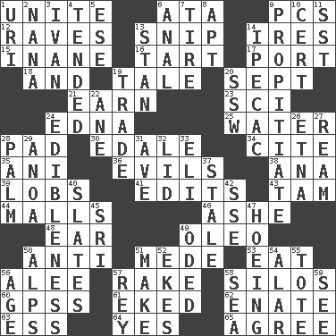 ACROSS 1. Join together 6. _ moment's notice (2 wds.) 9. Personal Computers (abbr.) 12. All-night dance parties 13. Sever or remove by pinching or nipping 14. Angers 15. Empty; void 16. Small pie 17. Left side of a ship or aircraft 18. Added to 19. Story 20. Back-to-school mo. 21. Merit 23. _-fi 24. Pulitzer Prize-winning author Ferber 25. Wetness 28. Writing tablet 30. Peak District village in England 34. Quote 35. Cuckoo 36. Vices 38. Santa ___, CA 39. Tennis shots 41. Proofreads 43. Scottish cap 44. Promenades 46. American tennis player Robert 48. Hearing organ 49. Butter sub 50. Against 51. Ancient Persian 53. Consume 56. Toward shelter 57. Libertine 58. Grain storage towers 60. Global Positioning Systems (abbr.) 61. Supplemented with great effort 62. Maternal 63. Double-curved letter 64. It is so 65. Match DOWN 1. RI univ. 2. Grandmother 3. "Terrible" tsar 4. Watched over 5. Compass dir. 6. Of or related to the anus 7. Become fatigued 8. Fitting 9. Appease 10. An absolute certainty 11. Fast jet (abbr.) 13. Comedian Laurel of Laurel & Hardy 14. Medicinal drug used to evoke vomiting 19. Swap 20. Compass dir. 22. One (Scot) 24. The property of being fit to eat 26. Inactive volcano in Sicily 27. 480, 500 or 516 sheets of paper 28. Inside of hand 29. Small Philippine buffalo 31. "___ Maria" 32. Flaplike covering 33. Connecticut Ivy Leaguer 37. Having lost freshness 40. Chalkboards 42. Compass dir. 45. _ Lanka 47. Cultivating 49. Wrote a lyric poem 50. High mountains 51. Cause to be 52. Makes supply last 54. Having or resembling wings 55. Carryall 56. Ripen 57. Marina Del _, California 58. Ocean 59. Perceive with the eye