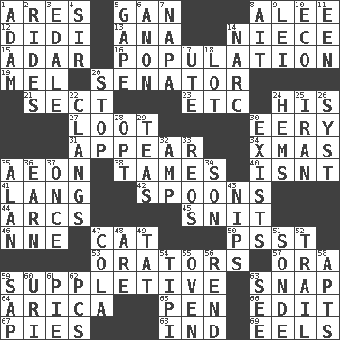 ACROSS 1. Ancient Greek god of war 5. Separate the seeds from cotton 8. Toward shelter 12. "You Light Up My Life" star Conn 13. Santa ___, CA 14. Sibling's daughter 15. The sixth month of the Jewish calendar 16. Census information 19. Cartoonist voice _ Blanc 20. Elected representative 21. Religious group 23. And so on (abbr.) 24. Part of HMS, perhaps 27. Spoils 30. Suggestive of the supernatural 31. Seem 34. Dec. holiday 35. A really long time 38. Corrects by punishment or discipline 40. Is not 41. Austrian-born American filmmaker Fritz 42. Soup utensils 44. Curves 45. In a ____ (agitated or irritated) 46. Compass dir. 47. Domesticated feline 50. Inconspicuous attention getter 53. Speakers 57. Mouth or opening 59. Supplying deficiencies 63. Fastener 64. N. Chile seaport 65. Writing instrument 66. Prepare for publication 67. Sliced desserts 68. Working for oneself (abbr.) 69. Snakelike fish DOWN 1. First of billions? 2. Amusement-park features 3. Peak District village in England 4. Title for a knight 5. Open wide 6. Soon (poet.) 7. California wine valley 8. Small island 9. Flowery wreath 10. Environmental prefix 11. Car or cant ending 14. Drug cop 17. Shoshoni 18. Car dealer's back yard 20. Halt 22. Rings loudly 24. Is hesitant and indecisive 25. SW Asia republic 26. System (abbr.) 28. Elect 29. Afternoon social gatherings 30. Has an existence 32. Electrical Unit 33. Vintage cars 35. Actor Alda or Thicke 36. Merit 37. At one time in the past 39. Boy, to dad 43. Cuts off 47. Root beer relative 48. "We ___ not amused" (Victoria) 49. Make lace 51. Message 52. Drop behind 54. Native american tent (variation) 55. Baking chamber 56. Tear apart 58. Tenement units (abbr.) 59. Plant excrement 60. RI univ. 61. Sliced dessert 62. Personal Computers (abbr.) 63. Perceive with the eye