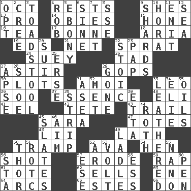ACROSS 1. Sep. follower 4. Musical pauses 9. "______ My Girl" (Turtles hit) 13. Adept person 14. Off-Broadway awards 15. Dwelling 16. Beverage made from leaves 17. Maid-servant 18. Operatic vocal solo 19. Begley and Asner 21. Fish or hair follower 22. Small fatty European fish 24. Chop _ 26. Bit 27. Moving about 29. Republicans 30. Ground plans 31. Mine, in Marseilles 33. Lion 36. "Barney Miller" actor Jack 37. Substance 40. Connecticut Ivy Leaguer 41. Snakelike fish 42. Wig 43. Drop behind 45. "Two Mules for Sister ____" 47. Hauls 48. Cards in a Roman deck? 49. Thin strip of wood or metal 50. _____ steamer (cargo ship) 52. Actress Gardner 54. Layer 56. Attempt 57. Wear away 59. Strike 61. Carryall 62. Makes a sale 63. Compass dir. 64. Curves 65. _____ Park, CO 66. Spanish title DOWN 1. Choose 2. Algonquian 3. Inedible or poisonous agaric 4. Director Reiner 5. Dark wood 6. Trig term 7. Portable shelter 8. Compass dir. 9. Broken pieces 10. Israeli folk dance 11. Send forth 12. Ocean 20. Set or collection 22. Unemotional 23. Infant food 25. Celtic language 27. Domed church section 28. A type of plum 29. Went 31. At sea 32. Was introduced to 33. Tough but pliablecoriaceous 34. Writer Wiesel 35. Petroleums 38. Remove all contents or possession from 39. Singer James 44. Writer of Portnoy's Complaint (1969) 45. Chalkboards 46. Direct toward a target or goal 49. Dipping utensil 50. Son of Odin 51. College mil. group 52. Ancient Greek god of war 53. Electrical Unit 55. Billionth: prefix 56. R.R. building 57. Compass dir. 58. Curvy letter 60. Animal enclosure