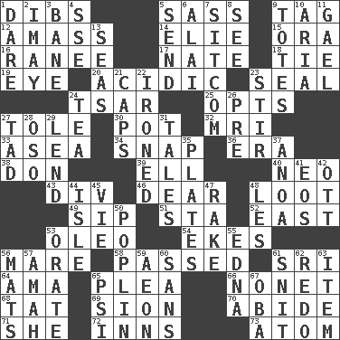 ACROSS 1. Rights 5. Backtalk 9. Label 12. Collect or gather 14. Writer Wiesel 15. Mouth or opening 16. The wife of a rajah (variant) 17. Nathan's nickname 18. Make a knot 19. Sight organ 20. Being or containing an acid 23. Lick closed 24. Russian ruler of old 25. Chooses 27. Lacquered or enameled metalware 30. Cooking vessel 32. Medical imaging device (abbr.) 33. Toward the sea 34. Fastener 36. Period 38. Spanish title 39. Pipe bend 40. Modern: prefix 43. HTML Container Element 46. Letter starter 48. Plunder 49. Small drink 51. R.R. building 52. Compass direction 53. Margarine 54. Supplements with great effort 56. Female horse 58. Went by 61. _ Lanka 64. Nursemaid (var.) 65. Entreaty 66. Music written for nine 68. Make lace 69. The Jewish people; Israel 70. Tolerate 71. A female animal or person 72. Lodging establishments 73. Smallest unit of an element DOWN 1. Have the gumption 2. "If ____ say so..." 3. Object of repulsion 4. Compass dir. 5. Post 6. Mountain range southwest of Kyrgyzstan 7. "Cheers" or "Ellen" 8. Observe 9. Lugs 10. Roberta Peters solo 11. Highlander 13. Oceans 21. Smile enhancers 22. Pressed 23. Move through with a circular motion 24. Afternoon social gathering 26. Before (prefix) 27. Small boy 28. Bear (Spanish) 29. Grant temporary use of 31. Stories 35. Food holders 37. Small Philippine buffalo 41. Greek goddess of the dawn 42. Baseball player Mel 44. Capri or Wight 45. Compete 47. Immoral or dissolute person 48. French article 50. Cotton for raincoats, e.g. 53. Speak pompously 55. Pulitzer Prize-winning author Ferber 56. Floor coverings 57. Housemaid 59. A really long time 60. Without 61. In a ____ (agitated or irritated) 62. Redecorate 63. A whole individual unit 65. 23rd letter of the Greek alphabet 67. Chief or king in Benin or Nigeria